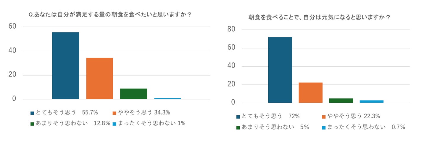 また、中高生の86%が週6日以上朝食を食べており、朝食習慣が定着していることが判明しました。約9割が「朝食に満足する量を食べたい」と回答し、7割以上が「朝食を食べると元気になる」と感じていることがわかりました。