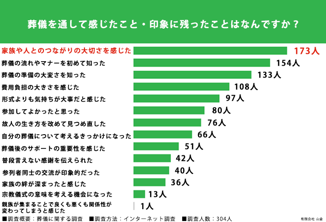 「葬儀を通して感じたこと・印象に残ったことはなんですか?(複数回答可)」と質問したところ、「家族や人とのつながりの大切さを感じた」(173人)、「葬儀の流れやマナーを初めて知った」(154人)、「葬儀の準備の大変さを知った」(133人)という結果になりました。