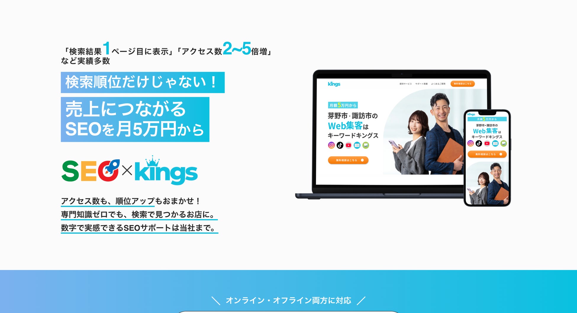 「キーワードキングス」は、茅野市・諏訪市エリアの事業者様に特化したWeb集客・SNS運用代行の総合サービスです。Instagram、TikTok、YouTubeなどのSNS運用代行に加え、SEO対策、MEO対策、ホームページ制作まで、デジタルマーケティングに必要な施策をワンストップで提供いたします。
