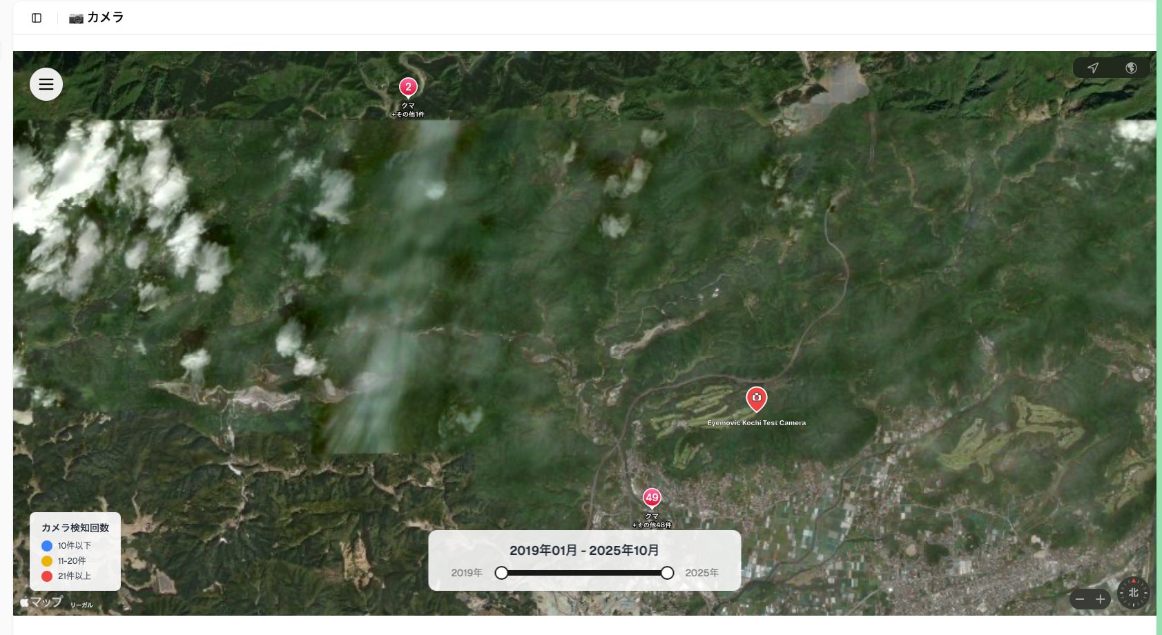 検知情報を自動で地図上に反映し、出没頻度や傾向を可視化。猟友会などと共有することで、効率的な対策立案を支援