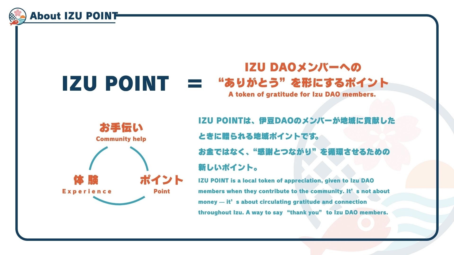 IZU DAOは、旅する人・住む人・働く人が、垣根を超えてゆるやかにつながりながら “IZUを一緒に育てる”ためのコミュニティです。誰もが地域や文化に関わる“お手伝い”に参加でき、お手伝いに応じて “IZU POINT” が付与されます。