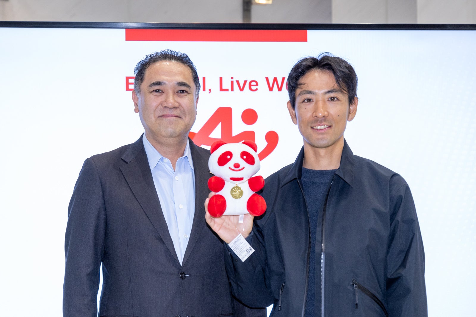 また、味の素㈱代表執行役社長:中村茂雄も登壇し、社員からの応援メッセージが入った“横断幕”と”アジパンダ”を渡部選手に贈呈。温かいエールを送りました。