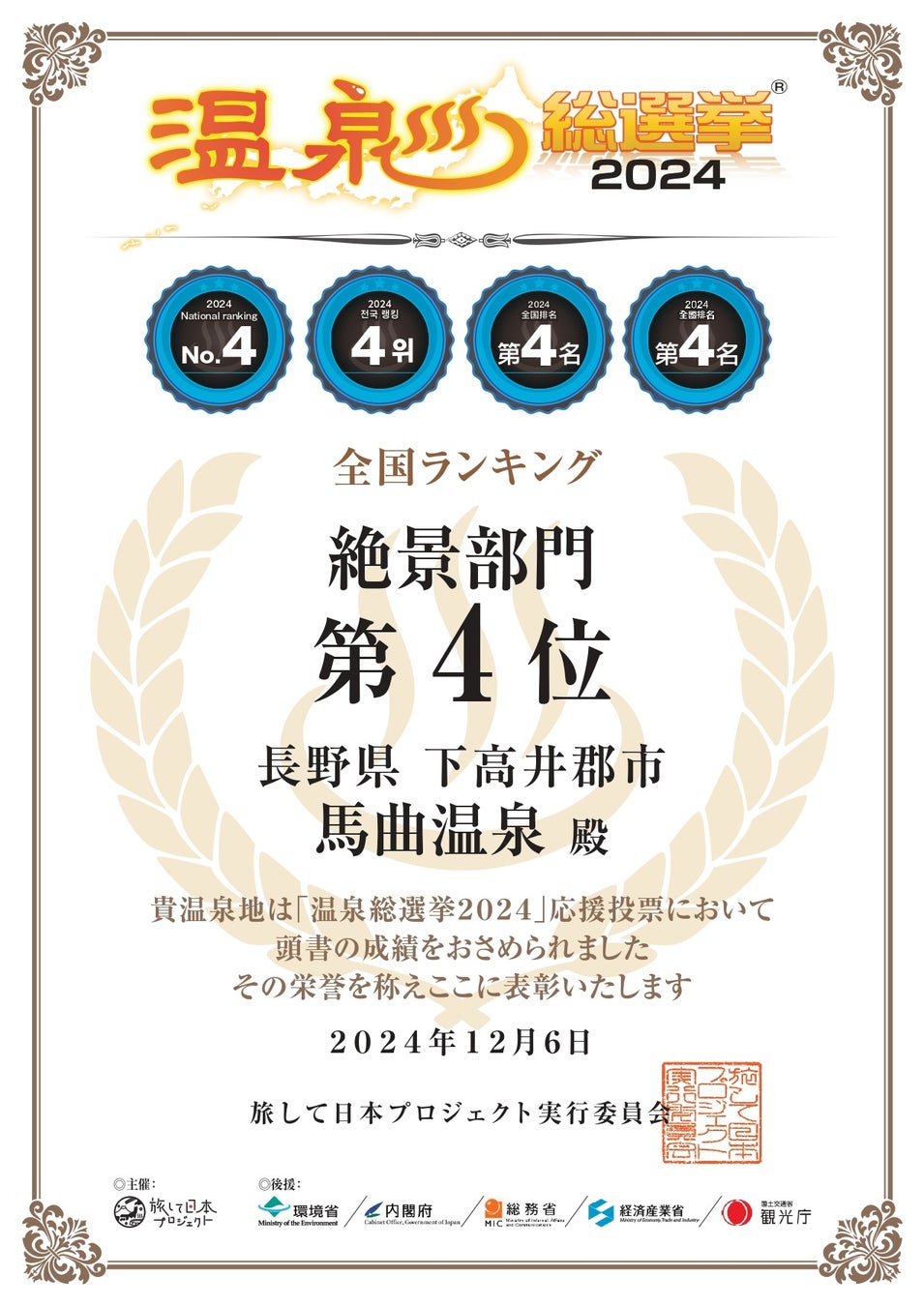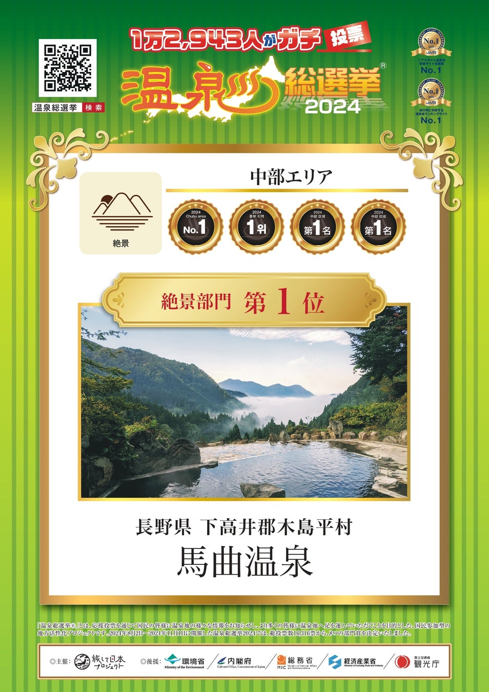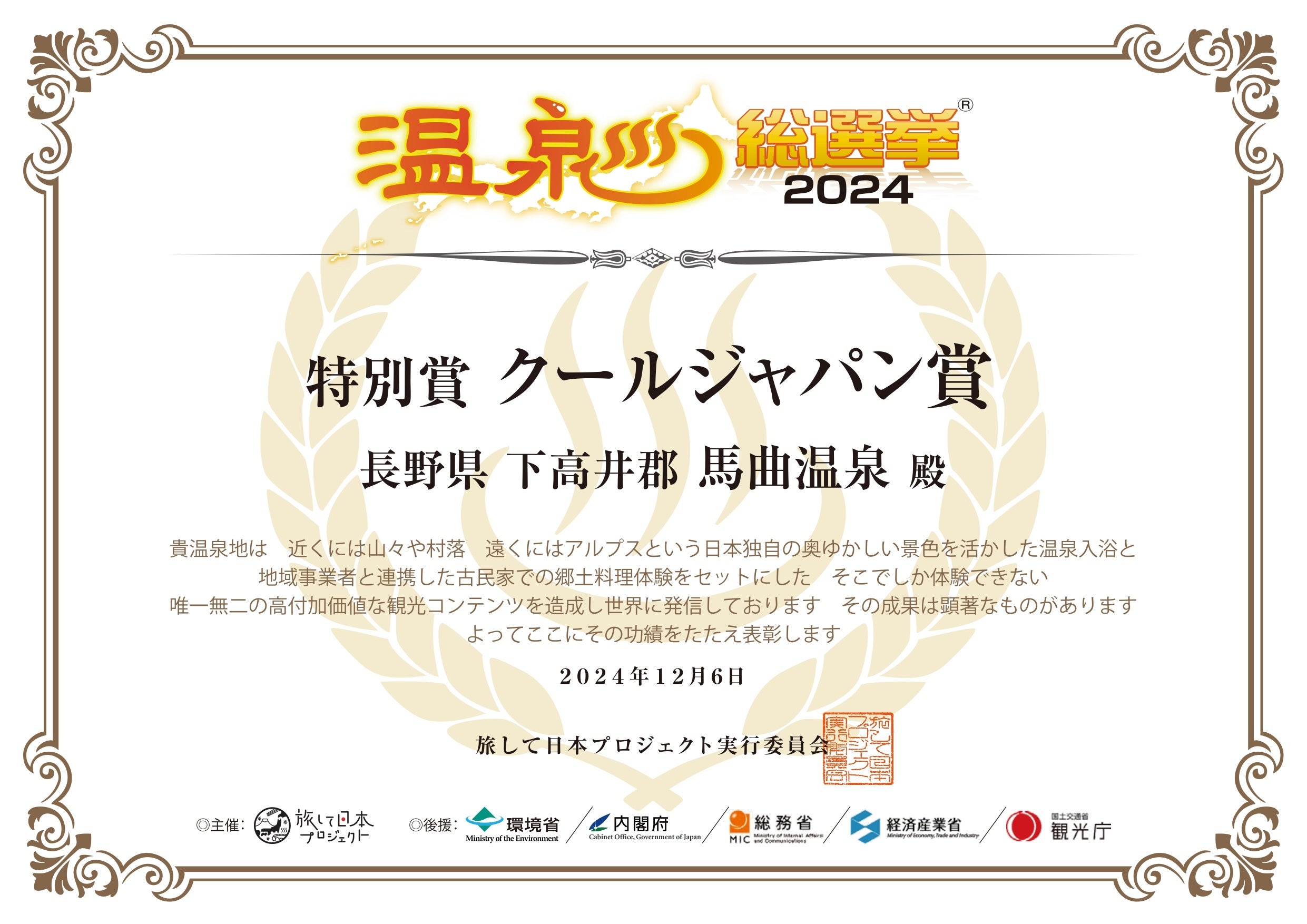 2024年の「温泉総選挙」では絶景部門で全国第4位・中部地方第1位を獲得し、特別賞「クールジャパン賞」を受賞。馬曲温泉は“北信州を代表する絶景の湯”として広く知られる存在となりました。
