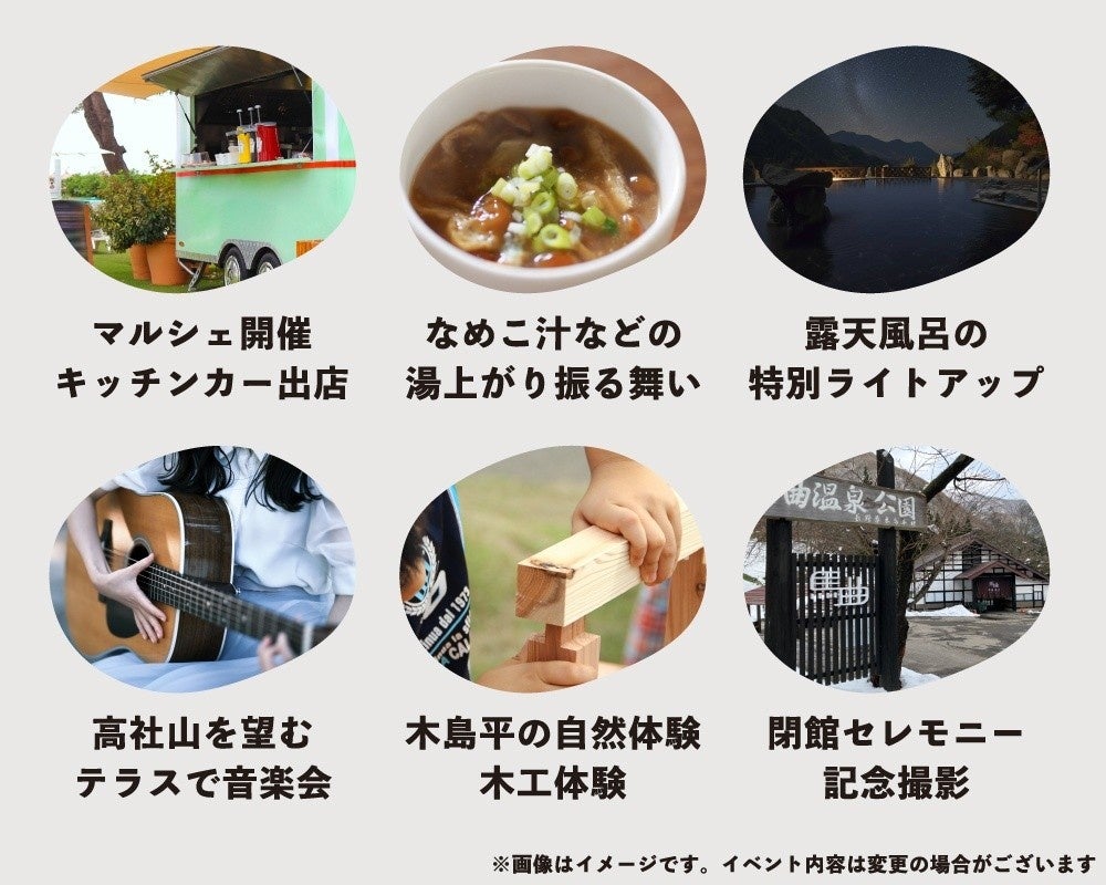 入浴はもちろん温泉前の広場を活用したさまざまな催しを予定しており、これまでご愛顧くださった皆さまとともに、馬曲温泉の歩みを振り返りながら思い出を分かち合う時間をお届けします。