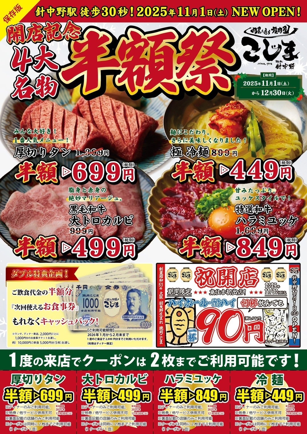 SNS 3000万 再生越え★話題の飲める焼肉!創業47年『焼肉こじま』針中野に17店舗目オープン!四大名物商品半額&次回半額キャッシュバック!?