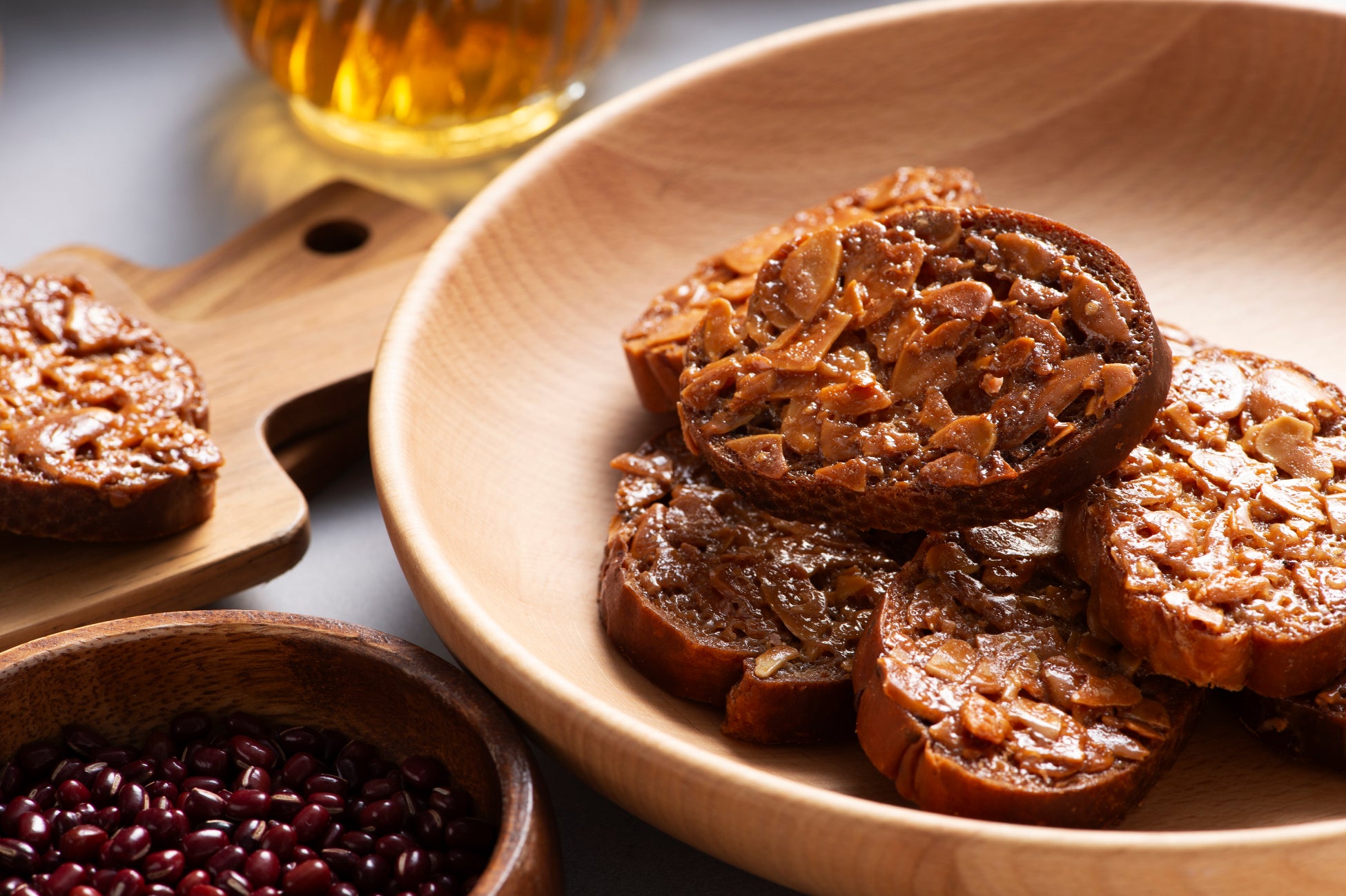 厳選した北海道産の小豆かのこと小豆餡を練りこんだフランスパン生地に、ヌガーとアーモンドスライスを丁寧に一つ一つ塗り、カリッとしっかり焼き上げました。