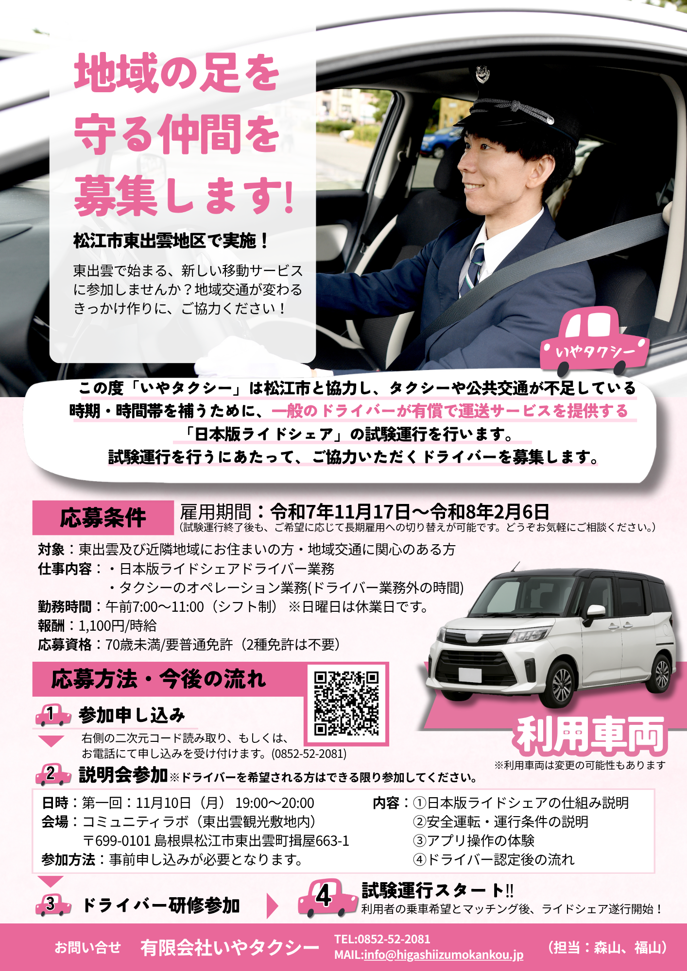有限会社いやタクシー(代表取締役:森山 雄宇/所在地:島根県松江市東出雲町)は、松江市の交通計画に沿って、東出雲地域で「日本版ライドシェア(交通空白等リ・デザイン全国展開プロジェクト)」の試験運行を11月末から開始します。