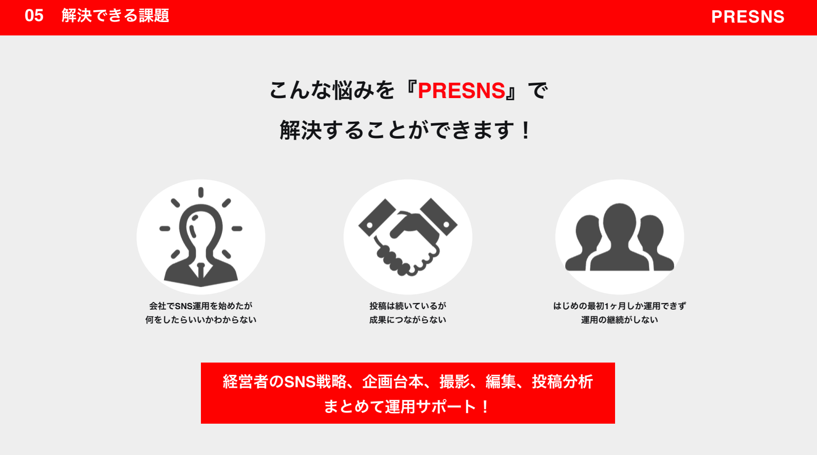 『PRESNS』の営業資料では、以下のような内容を詳しく解説しています。