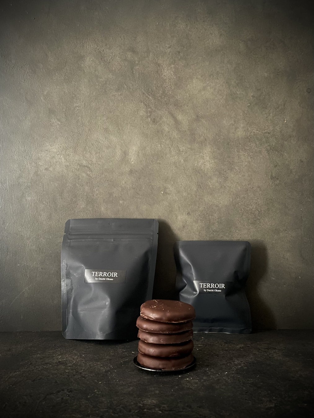 カカオ70%のショコラをたっぷりかけたザクザクのチョコがけクッキー。