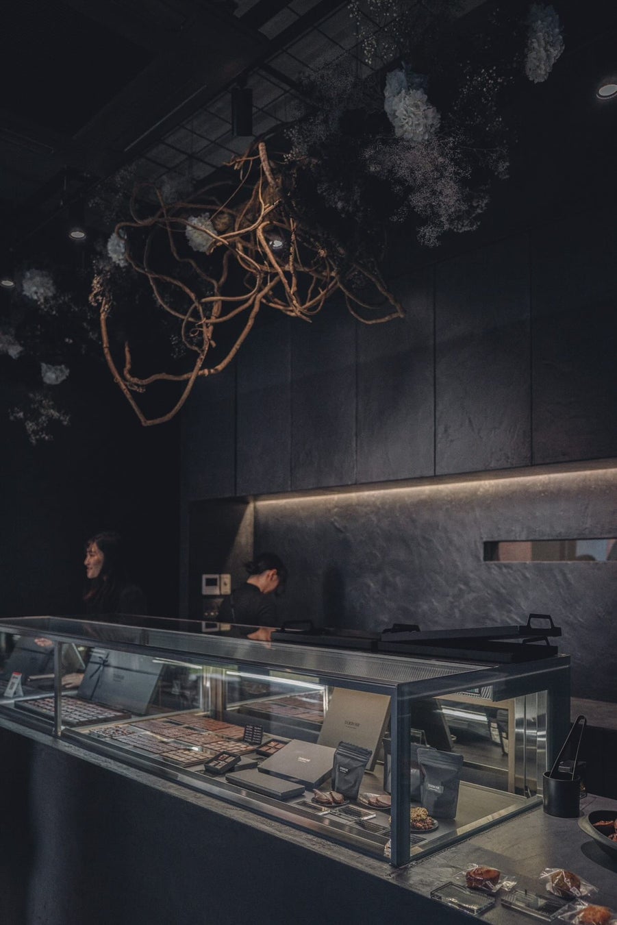 テーマカラーである黒を基調とした店内、約4mある開放感のある天井には装飾としてドライフラワーが飾られており、シックで洗練された大人の空間となっています。