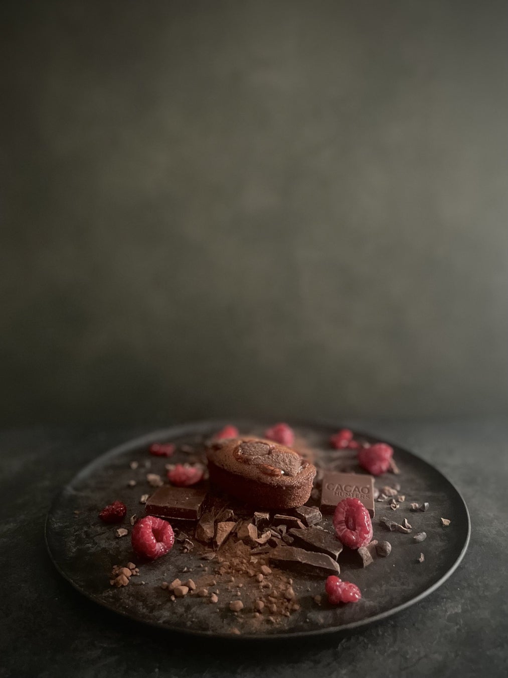 情熱大陸にも出演経験のある小方氏が率いるコロンビアのカカオハンターズ社のミニタブレットを1枚のせて焼き上げたショコラのフィナンシェ。
