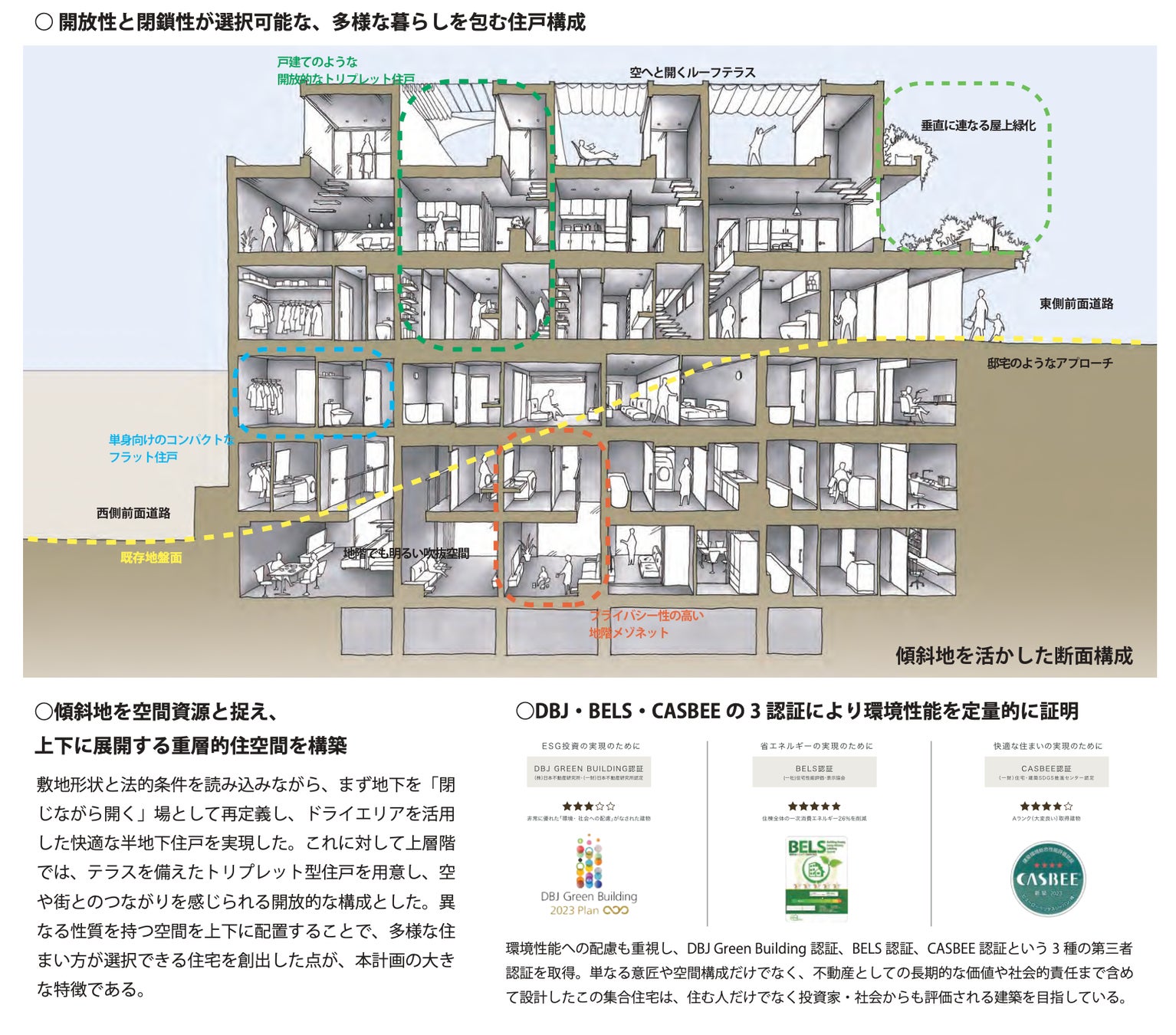 傾斜地を空間資源と捉え、上下に展開する重層的住空間を構築