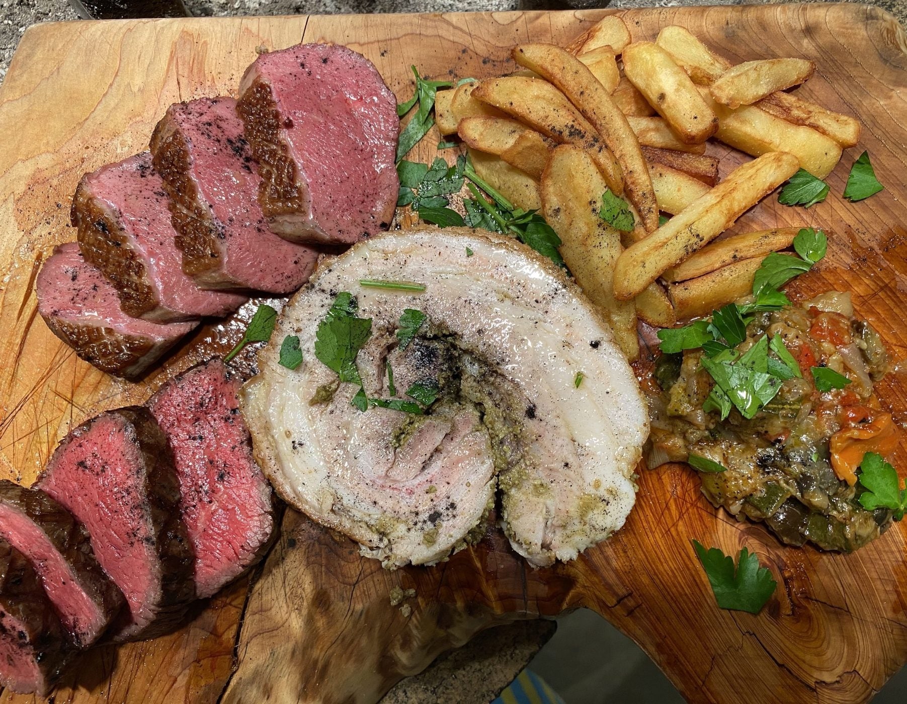 季節の前菜は魚介や野菜を中心に構成し、メインには熟成肉やポルケッタ、冬にはジビエも登場。