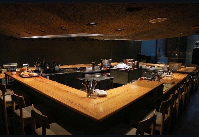 店内中央には炉が据えられ、360度を囲むカウンターから、シェフの一挙手一投足を臨むことができます。
