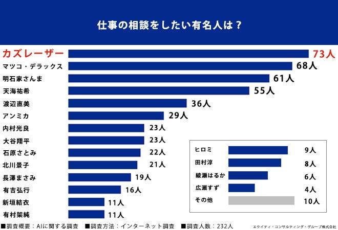 ・仕事の相談をしたい有名人ランキング第1位は「カズレーザーさん」(73人)、第2位「マツコ・デラックスさん」(68人)、第3位「明石家さんまさん」(61人)
