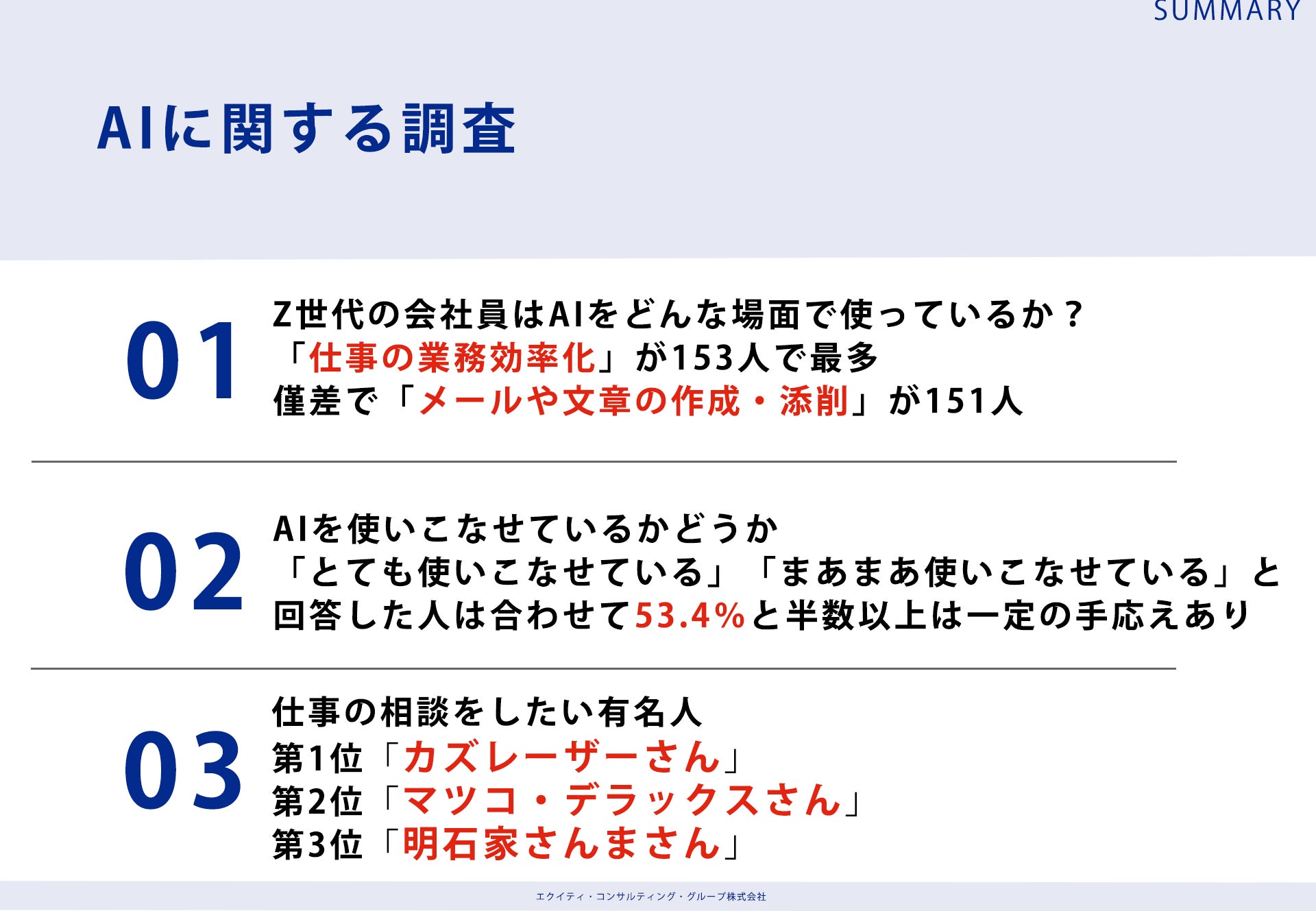 経営コンサルティングや生成AI導入支援を行っているエクイティ・コンサルティング・グループ株式会社(所在地:練馬区、代表者:中川晃太、https://www.ecgjapan.com/)は、ChatGPTなどのAIを使ったことがあるZ世代の会社員232名を対象に、AIに関する調査を実施しました。