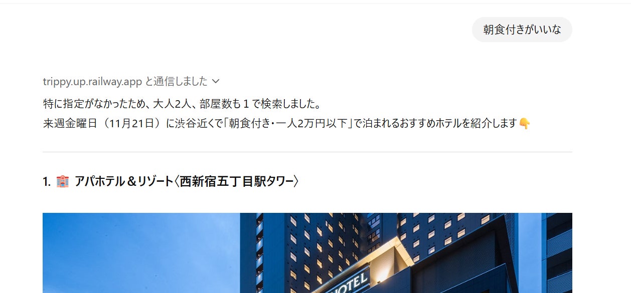 『Trippy』は、場所と日程を伝えるだけで、その日に空室があるホテルのプランを複数紹介してくれるAIエージェントです。
