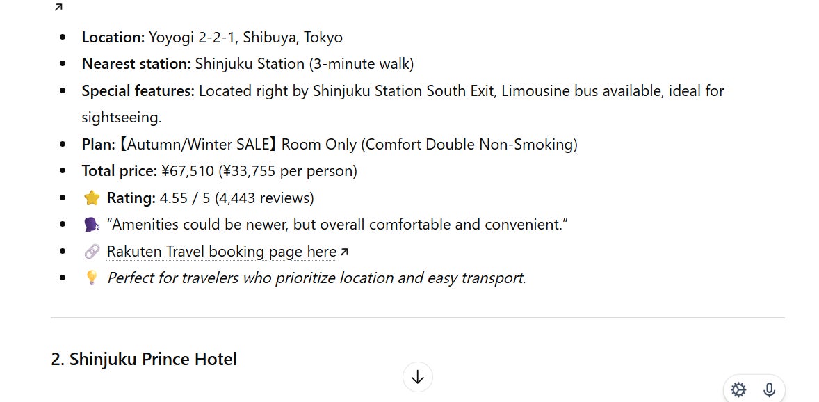 通常のChatGPTと同じく、会話文のなかに必要な情報を入れるだけでAIが意図を汲み取ってくれるため、ユーザーは友達と会話をするような感覚でホテルを探せます。