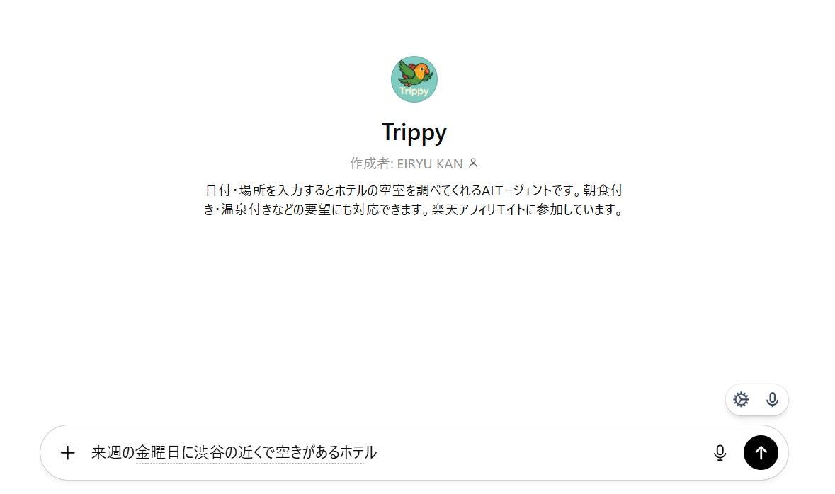 えいりゅうのAIエージェント、ChatGPT上でホテルの空室検索ができるカスタムGPT『Trippy』を公開