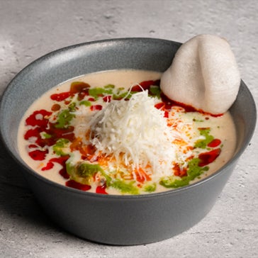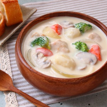 エビ・かき・サーモンをのせた、豆乳とゴマをベースにした野菜たっぷりの中華風クラムチャウダー。赤と緑のしびれる辛さのソースでクリスマスリースがアクセント。