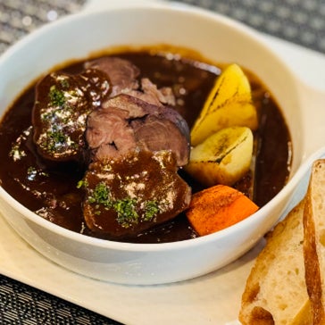 新潟の人気ブランド牛「あがの姫牛」の塊肉を20時間かけて仕上げた牛骨スープとともに赤ワインと香味野菜、デミグラスソースで8時間じっくり煮込みました。素材の力だけで引き出した深いコクと濃厚なうまみ。口に運ぶたび、ほろりとほどける柔らかさと豊かな味わいが広がります。