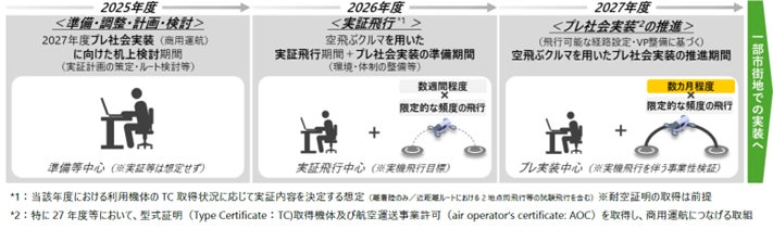 本プロジェクトは、東京都と事業者が連携し、次世代モビリティである「空飛ぶクルマ(eVTOL(*3))」の社会実装を目指す取り組みです。2030年の市街地実装に向け、官民の協働体制を強化し、東京の“空の移動革命”を推進します。2025年度からの3か年で、臨海部・河川上エリア(空港アクセスを想定)での飛行および実証を実施します。