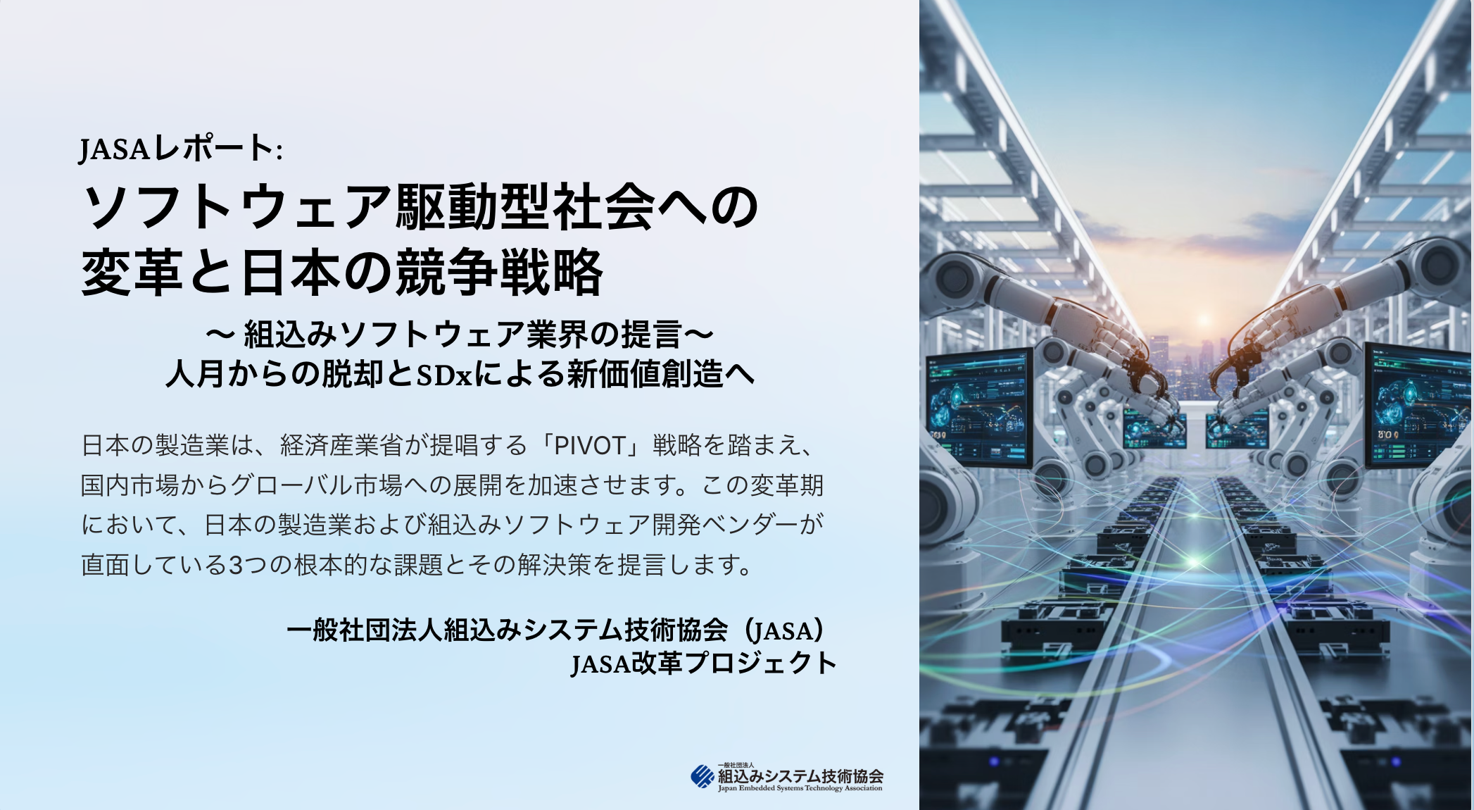 一般社団法人組込みシステム技術協会(JASA)は本日、協会内に設置した「JASA改革プロジェクト」がとりまとめた新レポート「ソフトウェア駆動型社会への変革と日本の競争戦略」を発表いたしました。本レポートは、AI技術の進化を背景に、日本の製造業および組込みソフトウェア業界が直面する構造的課題を分析し、国際競争力を再獲得するための具体的な戦略を提言するものです。