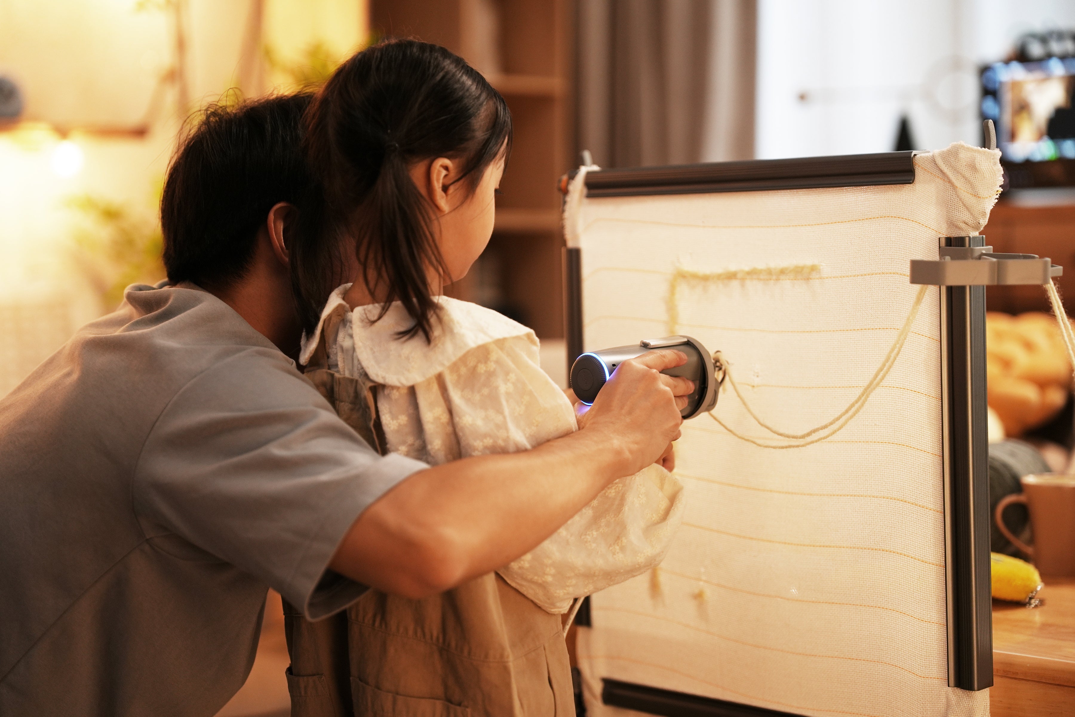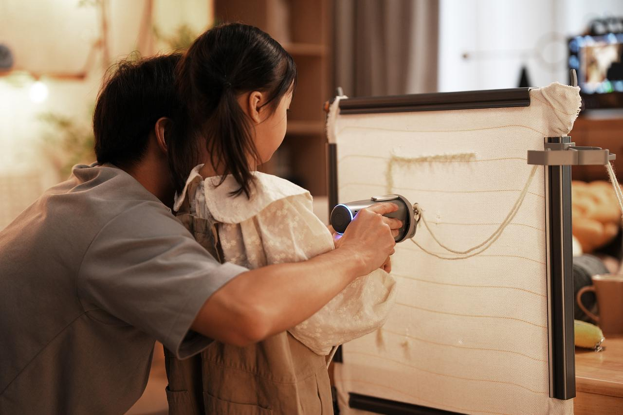 ご家族で安心してご使用いただけるよう、安全性を徹底した設計を採用しています。糸や髪の巻き込みを防ぐ密閉型ボディを備えているほか、モーターに負荷がかかった際には自動で停止する保護機能も搭載。また、フレームには釘を一切使用しない構造を採用しており、小さなお子さまと一緒の制作でも安心してお楽しみいただけます。