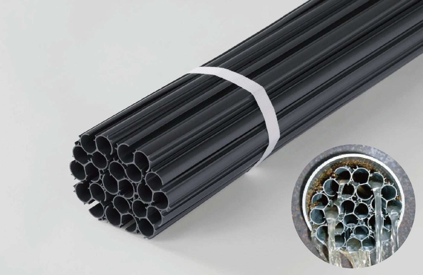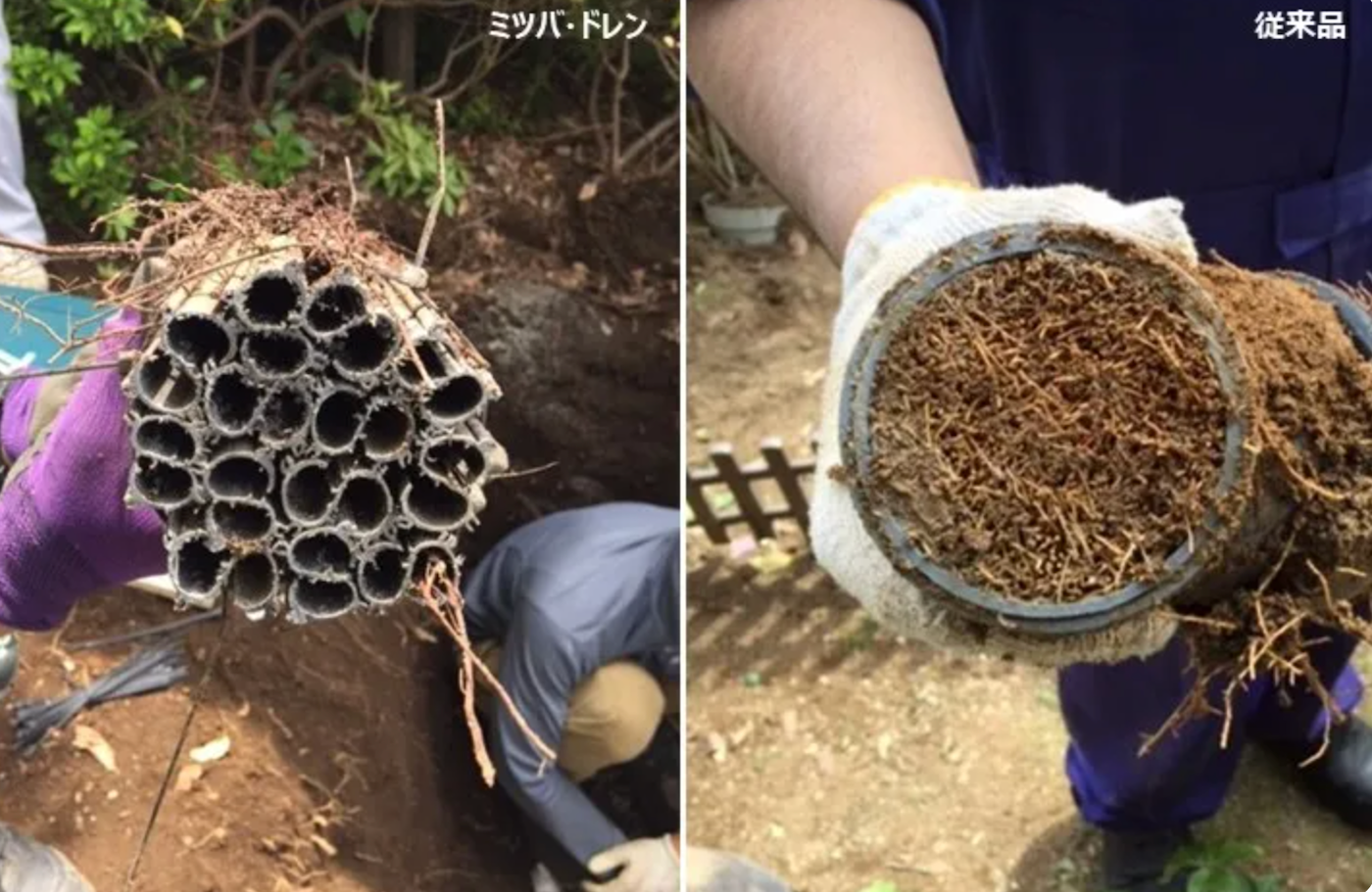 「ミツバ・ドレン」は、古来の竹暗渠に着想を得て開発された三つ葉構造の排水管です。