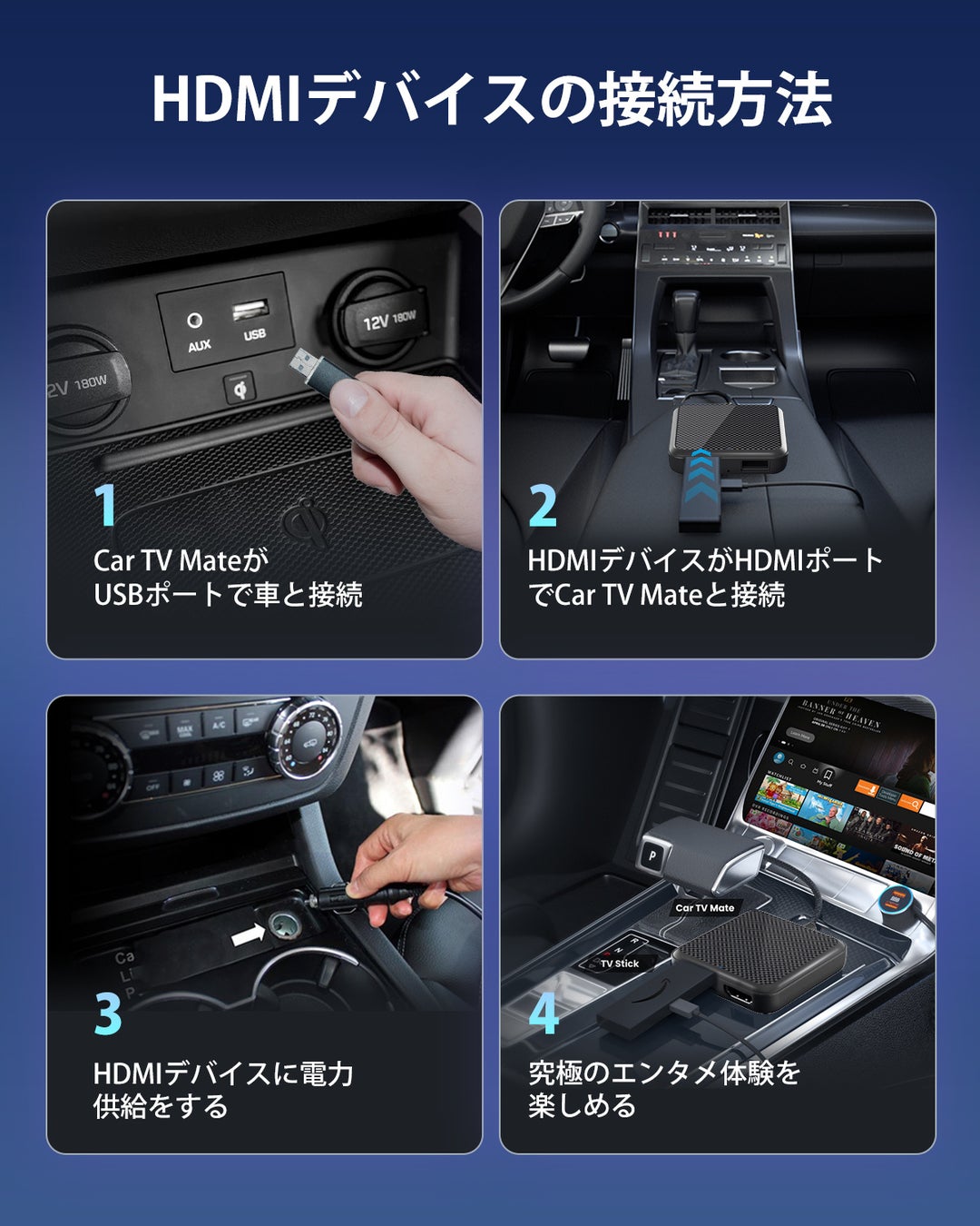 複雑な設定は一切不要。誰でも数分で接続でき、車内があっという間にホームシアターに変わります。