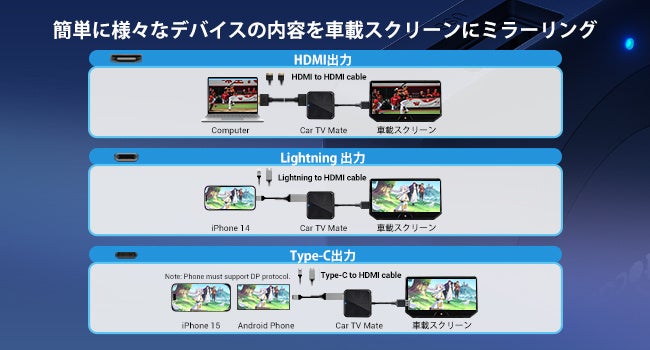 ・ミラーリング:iPhone 15シリーズ(USB-C)/DP Alt Mode対応Androidに対応。端末やアプリの仕様により再生制限がかかる場合があります。