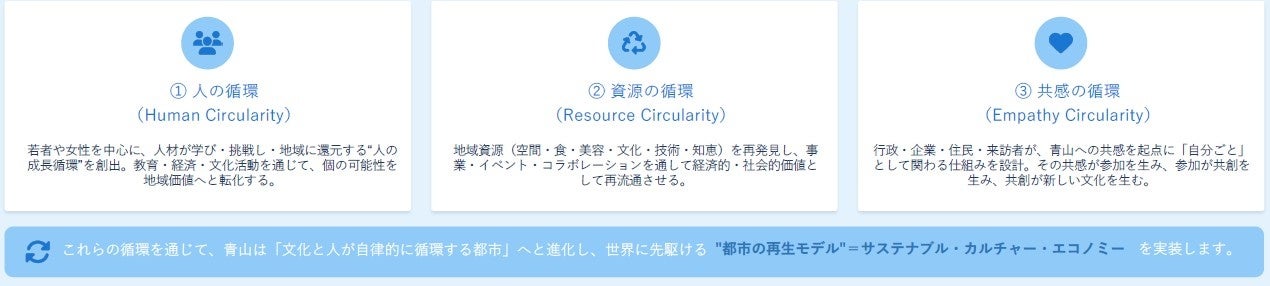 ⻘⼭の強みである「上質」「創造」「⽂化発信⼒」を活かし、以下の3つの循環を街全体に実装します。
