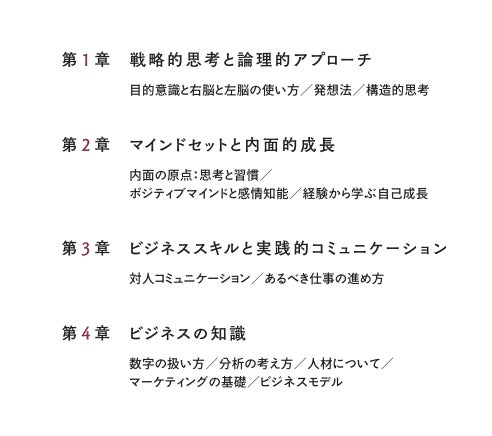 実践重視の構成 - 4章構成で「戦略的思考と論理的アプローチ」「マインドセットと内面的成長」「ビジネススキルと実践的コミュニケーション」「ビジネスの知識」を網羅