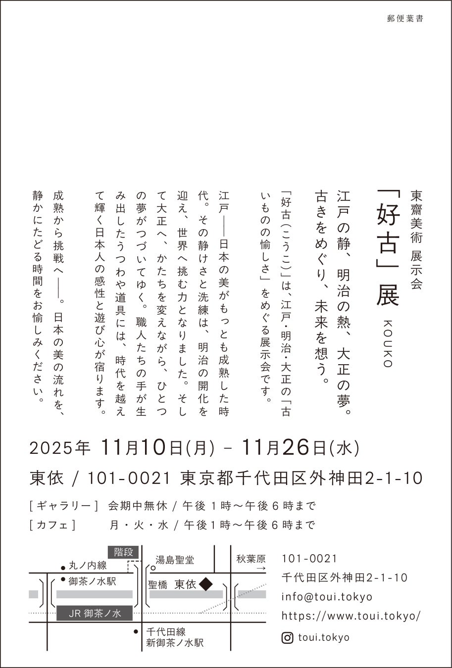 2025年11月10日(月)から11月26日(水)まで、千代田区外神田のアートスペース「東依」にて、東齋美術による展示会「好古(こうこ)」を開催いたします。