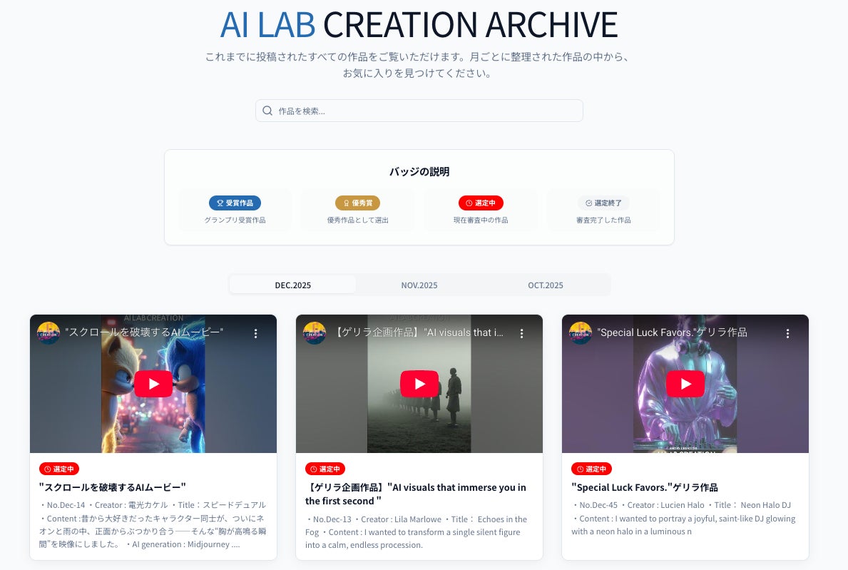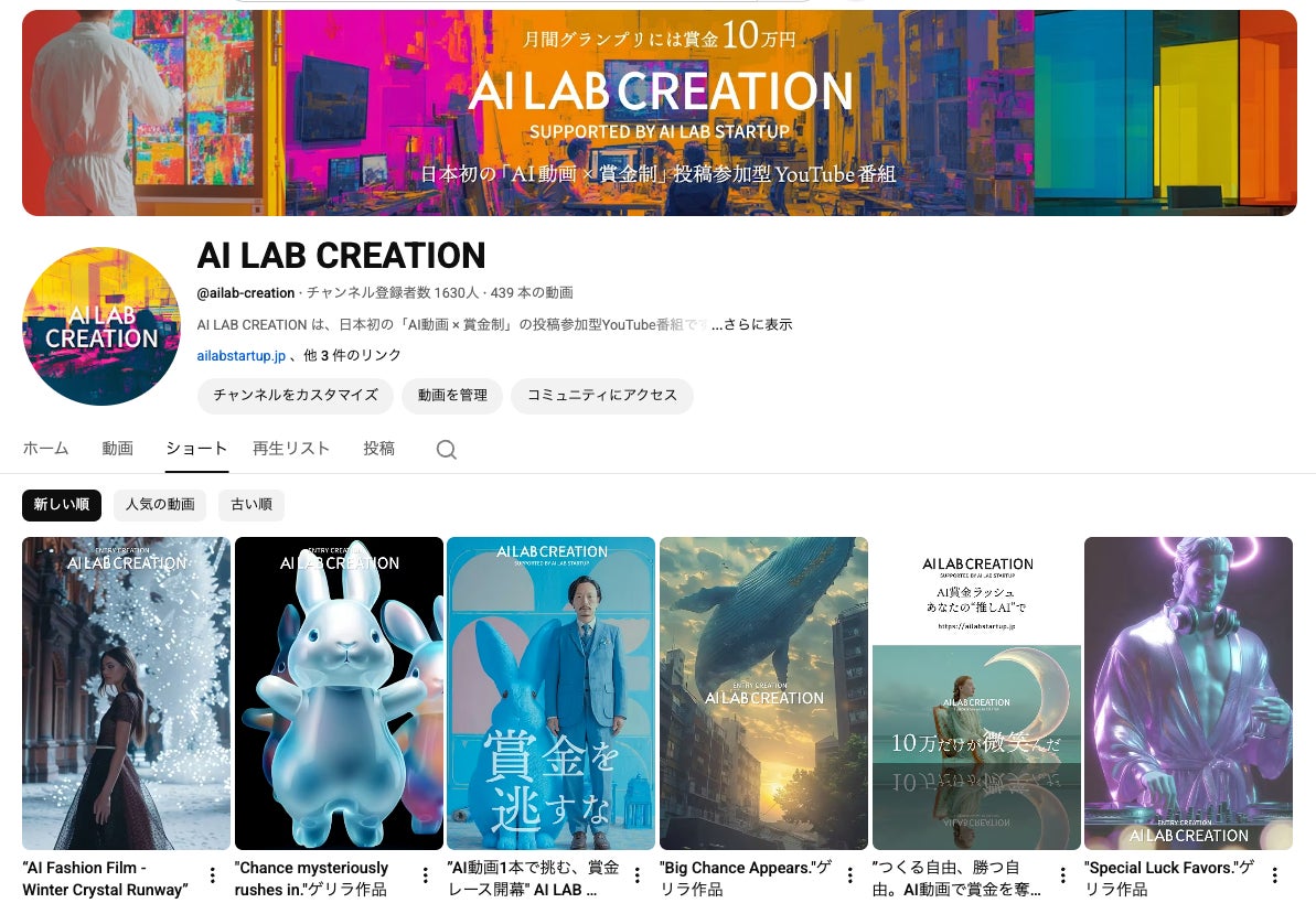 AI LAB CREATIONは、生成AIで制作したショート動画を投稿し、毎月グランプリを決定する参加型YouTube番組です。