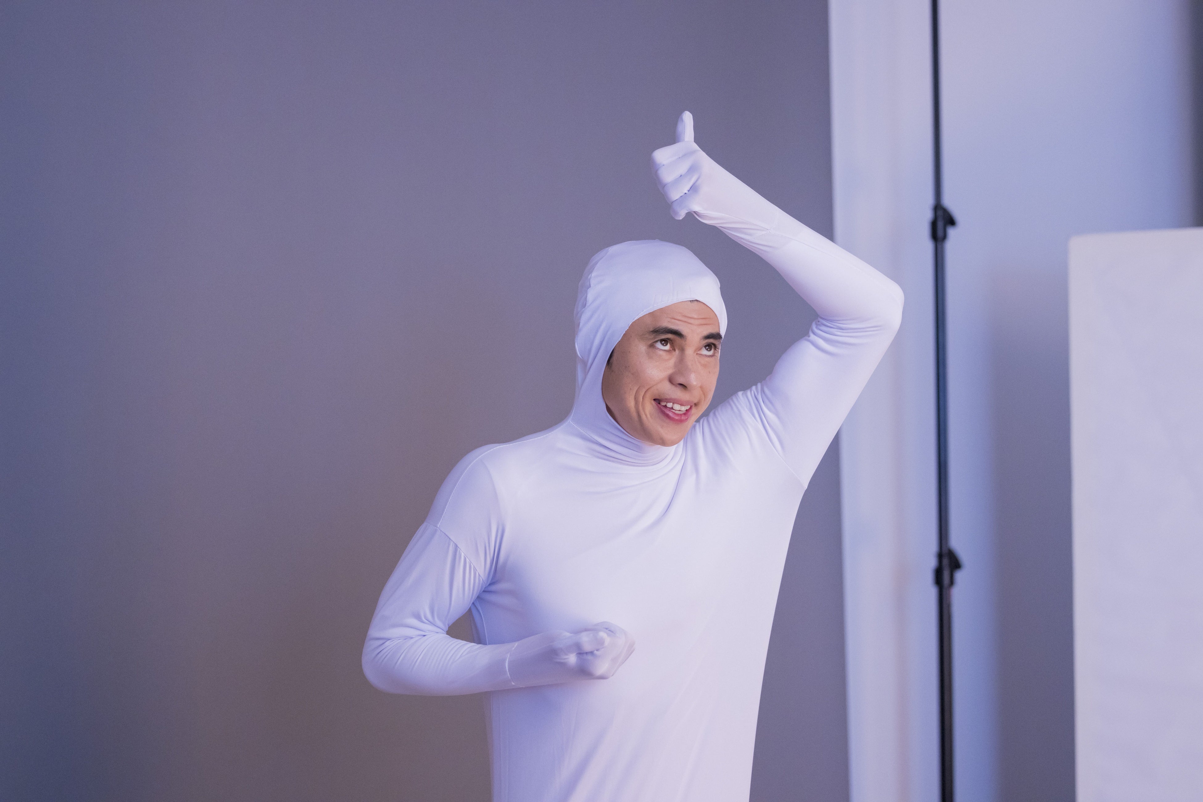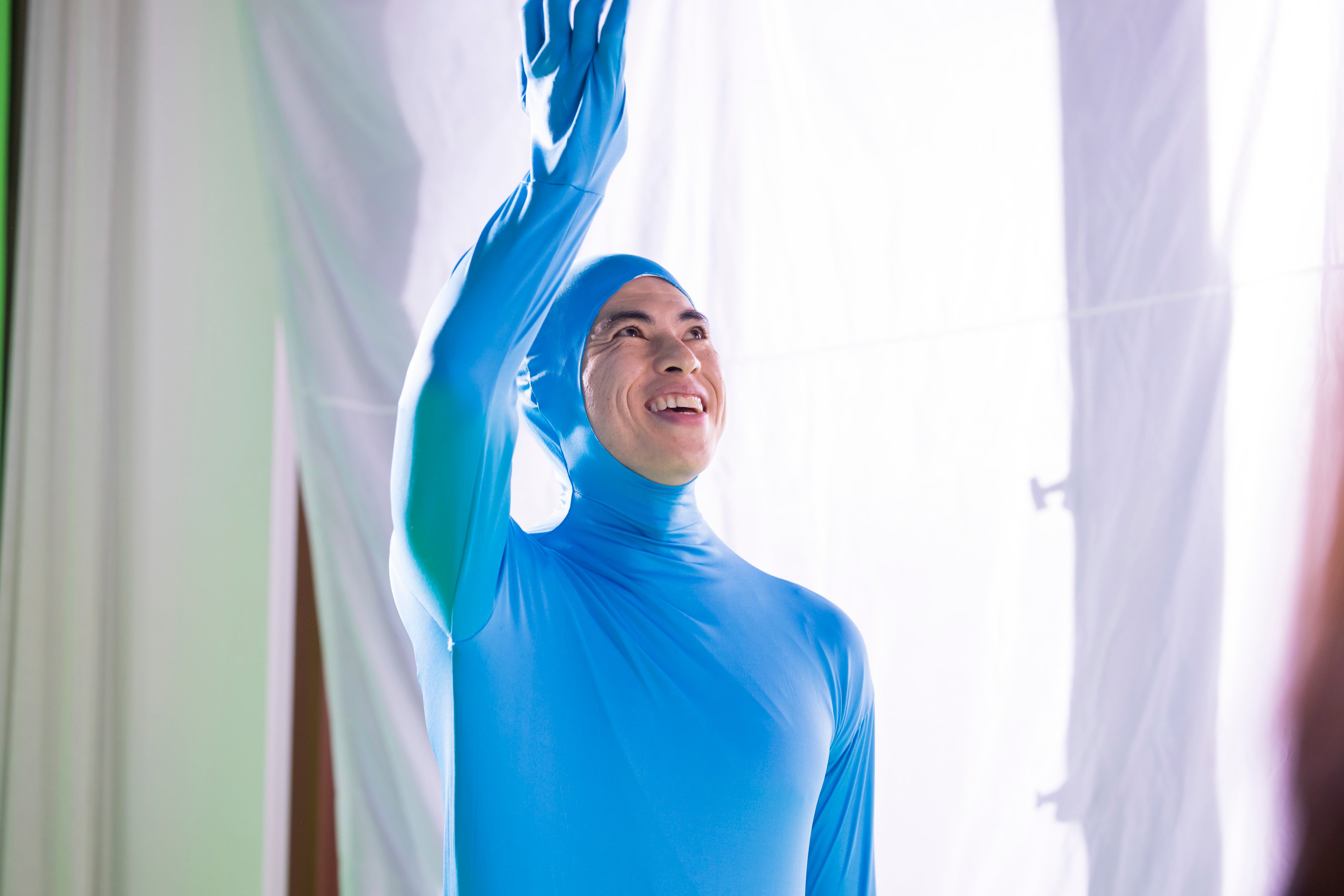 小島さん:白と青の全身タイツをめまぐるしく交換していく撮影で、白タイツの時には、コンセプト通り浄化されている感じの気持ちをしっかり作ってやっていました。