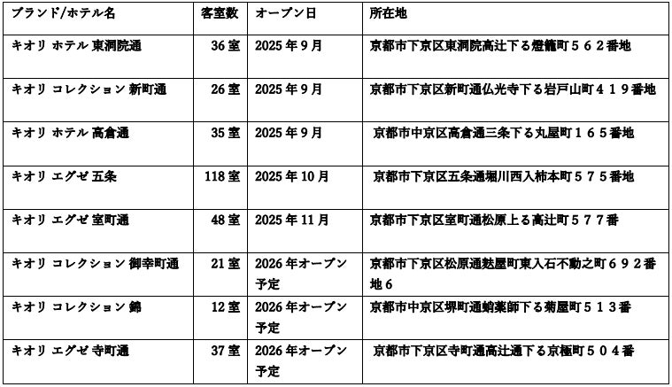 新しいホテルグループ「KIORI Portfolio」は、京都市内に8つの施設を展開予定。そのうち5つはすでにオープンし、次の3つも順次開業を予定しています。各ホテルは、和の美意識とモダンな快適性を融合させたデザインを追求しています。