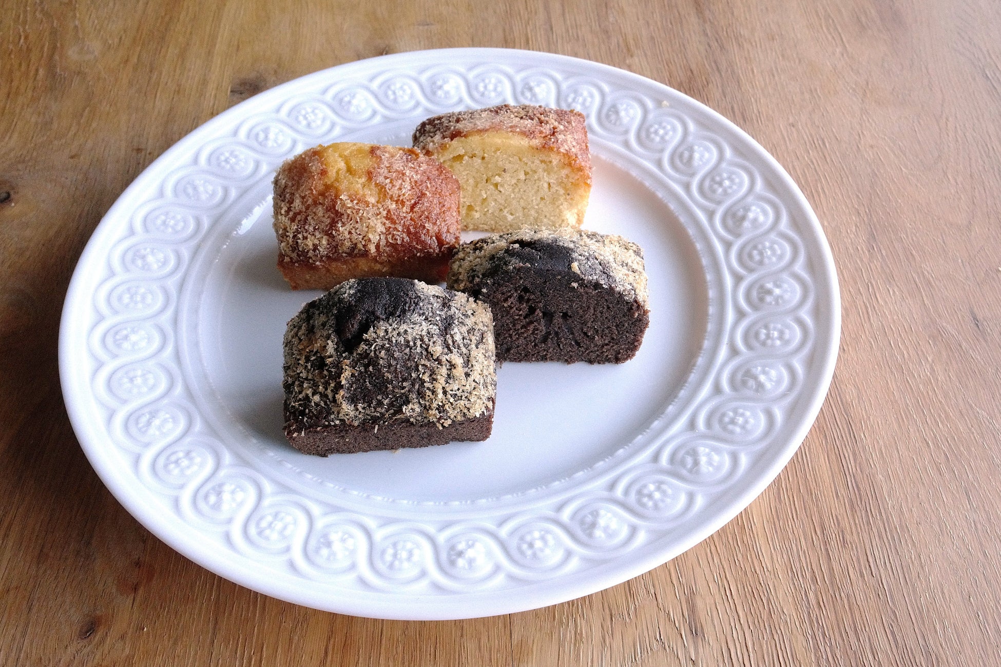 伝統的なマドレーヌのレシピをベースに、パウンドケーキ型に焼き上げた、横濱東風軒オリジナルケーキ。台湾カステラ同様砂糖を減らし、はちみつとバターで優しい甘さと豊潤な香り、さらにローストココナッツがオリエンタルなアクセントを加えています。フレーバーは4種類。プレーン、チョコレート、ライチ、紹興酒をご用意しました。