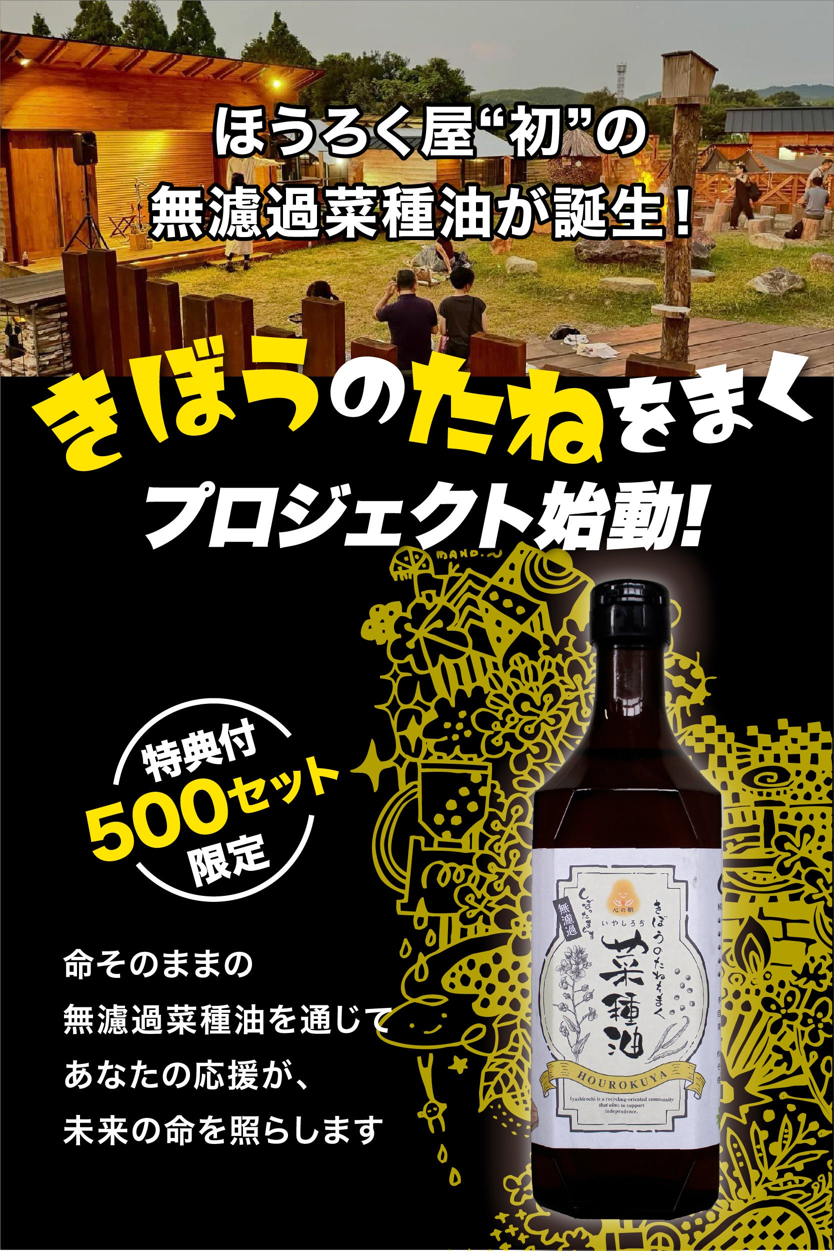 一般的には取り除かれる微細な粒子や旨み成分をあえて残し、搾りたての生命力と香りをそのまま閉じ込めています。血縁ゼロの継承者と、志に賭けた若き仲間の二人三脚で、消えゆく技術を“2人の365日”で繋ぎとめた軌跡。そこから生まれた初の“無濾過・純度100%”菜種油が、命のたねを静かに芽生えさせる、「きぼうのたねをまく菜種油」です。