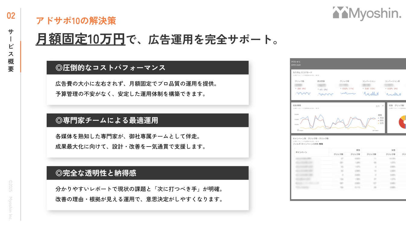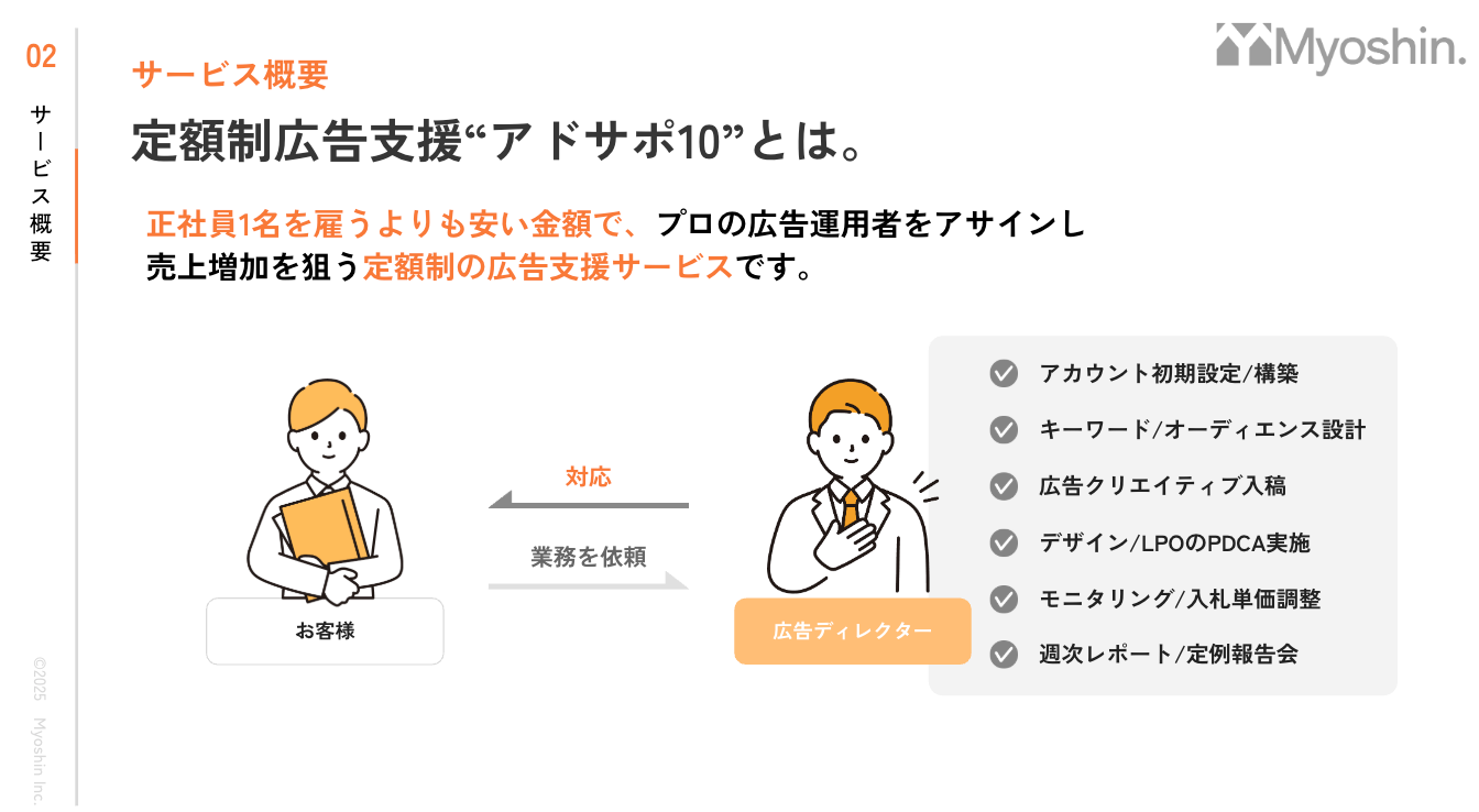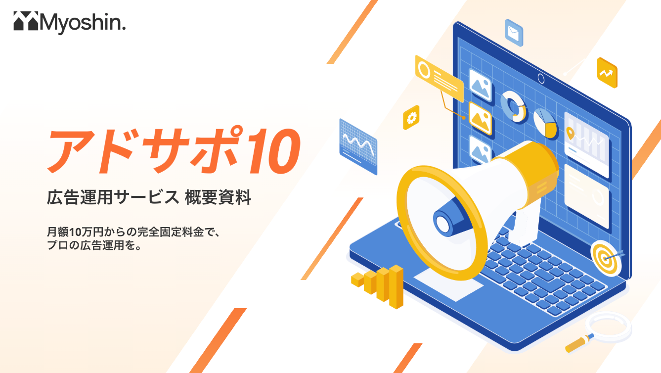 株式会社Myoshinは、正社員1名を雇うよりも安価な金額で、各媒体のプロフェッショナルによる高品質な広告運用を実現する新サービス「アドサポ10」の提供を開始いたしました。