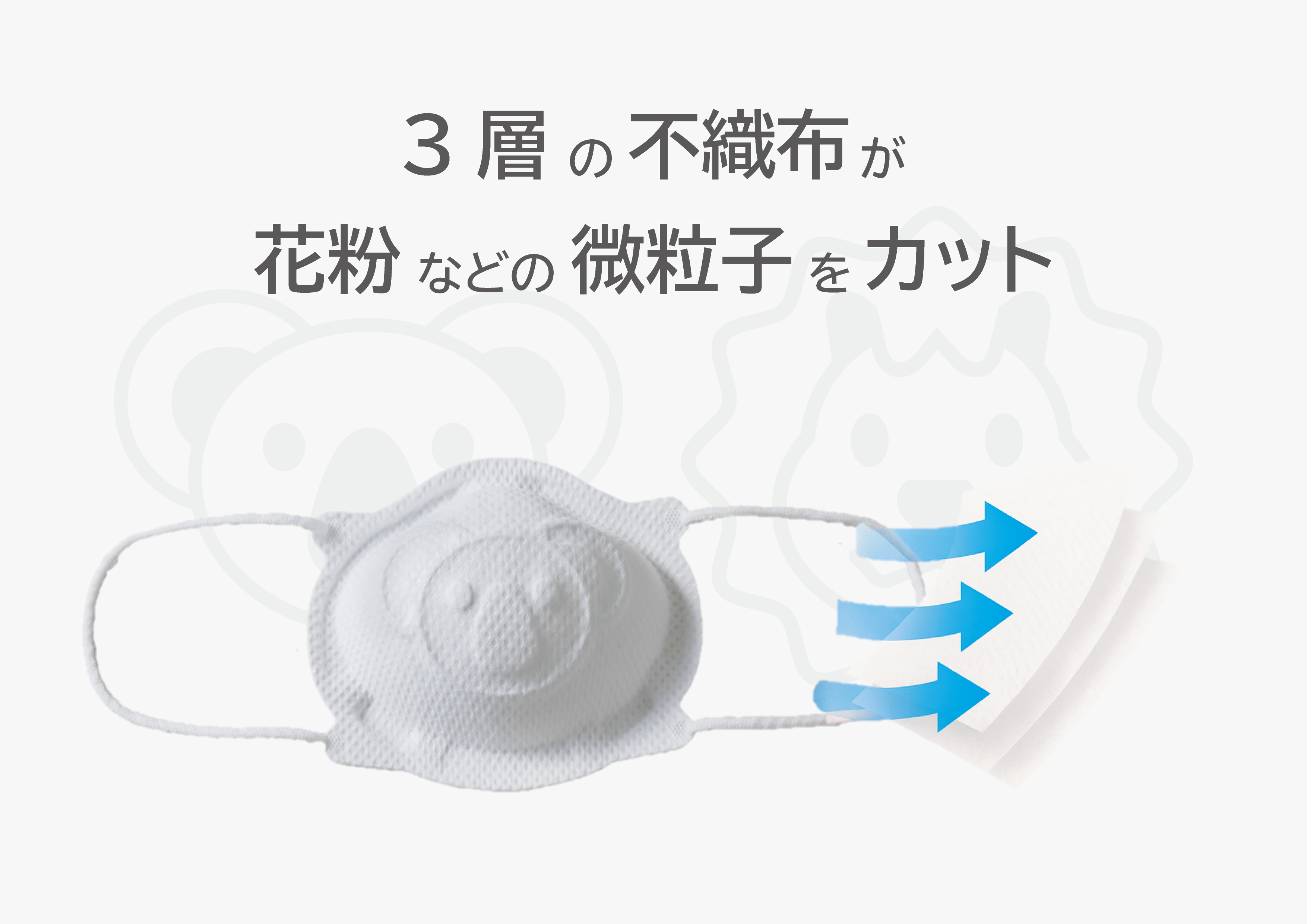 不織布三層構造×立体エンボス加工で「息ラク空間2.5cm」を確保。子どもが喜ぶライオン/コアラのゆるかわデザインで、通園・外遊びをサポート。