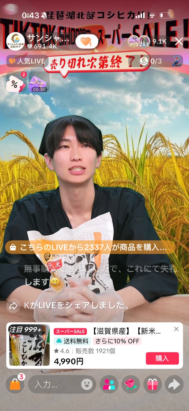 TikTok Shop Japanの公式認定TSP(TikTok Shop Partner)である株式会社Buzznomics(本社:東京都台東区、代表取締役:吉沢愛実)は、2025年10月27日から31日にかけ、滋賀県東近江市の生産者と連携し、高品質米をテーマとしたTikTok Shop LIVEコマースを実施いたしました 。本ライブでは、滋賀県産の高級米など合計約2,764袋を販売し、総売上1,500万円を突破。自治体連携とTikTok LIVE配信という革新的なモデルを確立しました。これは地域農産品のEC化を象徴する模範ケースとなり、人手不足や販路縮小といった地域課題に新たな解決の糸口を提示しました。