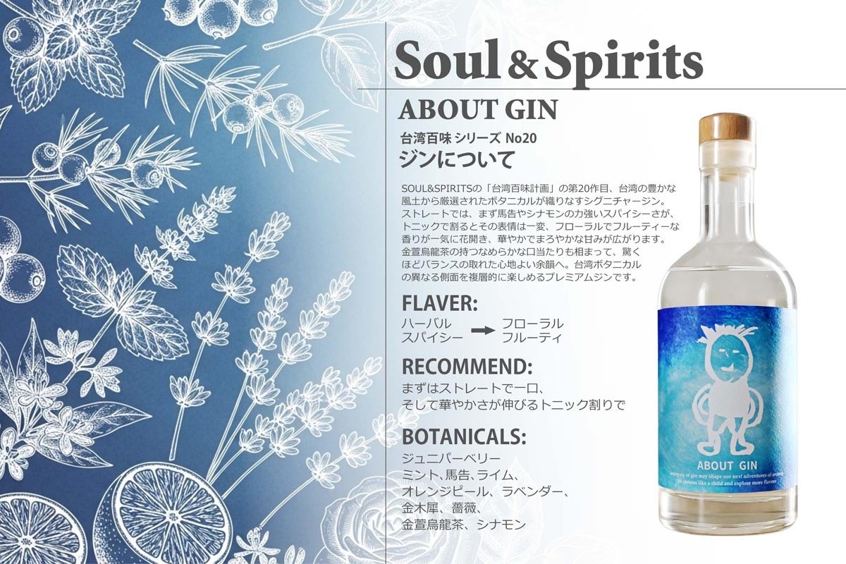 台湾におけるクラフトジンの開拓者として著名な鄭哲宇SOSO氏によるSOUL&SPIRITS「台湾百味計画」の第20作目、台湾の豊かな風土のボタニカルが織りなすシグニチャージン。