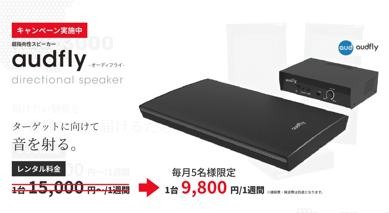 超指向性スピーカー『オーディフライ(audfly)』レンタル専用サイト(https://www.directional-speaker.com/)では、新規お客様限定の割引キャンペーンを実施中です。