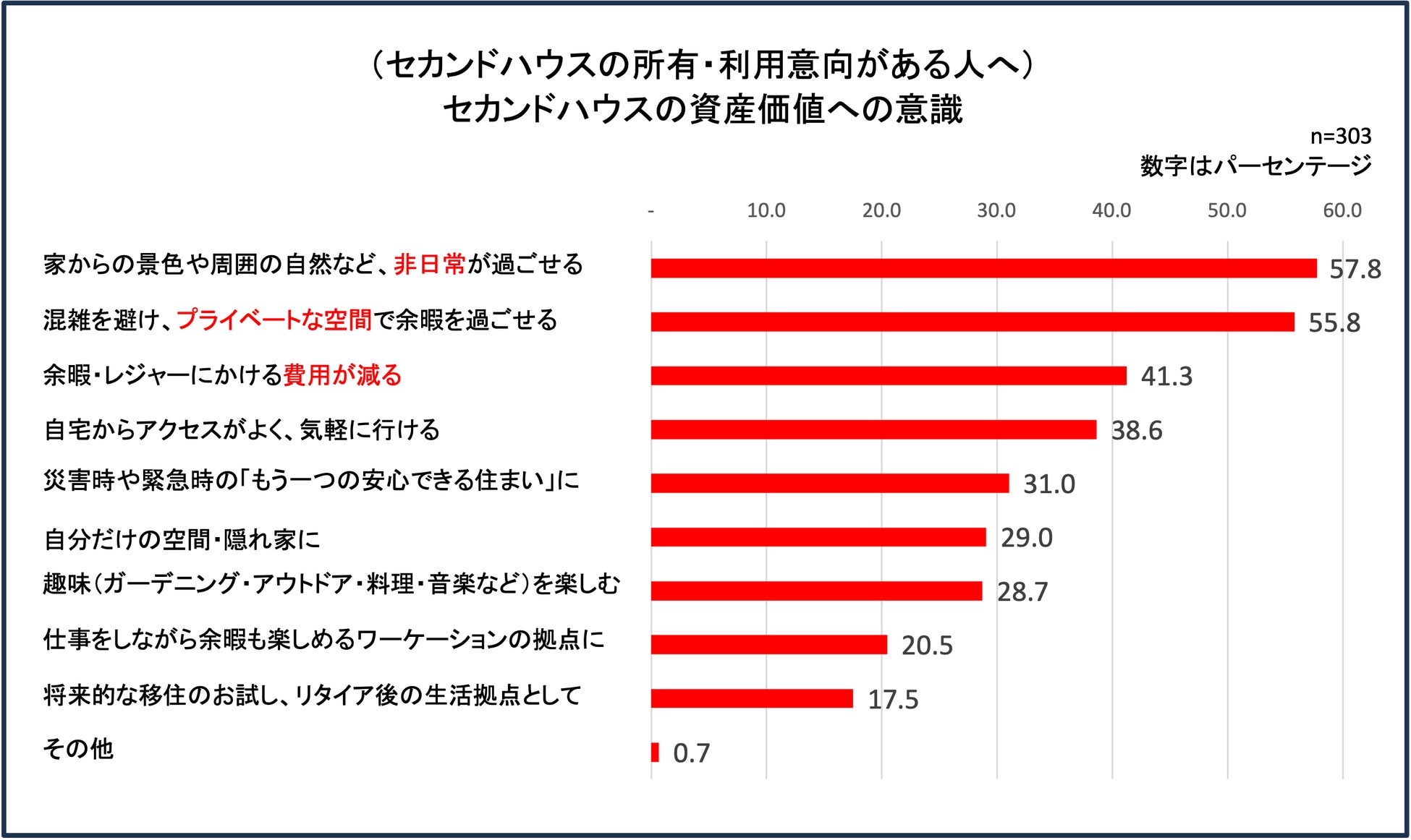 セカンドハウスの利用について、「期待すること」を聞くと(最大3つ)、「家からの景色や周囲の自然など、非日常が過ごせる」が57.8%で1位、「混雑する観光地やレジャー施設を避け、プライベートな空間で余暇を過ごせる」が55.8%で2位。3位の「余暇・レジャーにかける費用が減る」41.3%と合わせると、手軽で特別な体験を楽しめる手段として、セカンドハウスが機能していることが見て取れます。