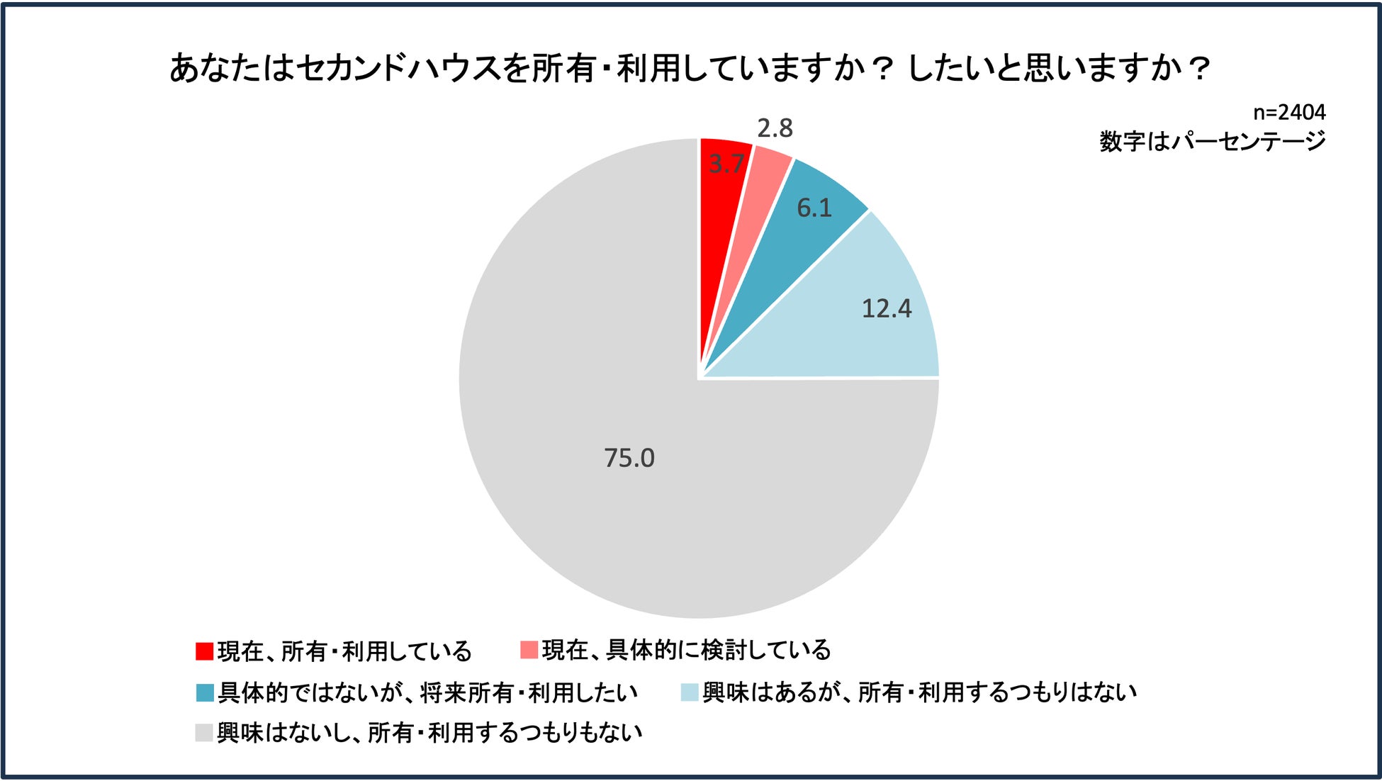 「あなたはセカンドハウス(別荘や二拠点住宅)を所有・利用していますか? したいと思いますか?」との設問を投げかけたところ、3.7%がユーザー層(現在、所有・利用していると回答)であることがわかりました。2.8%の検討層(具体的に所有・利用を検討している)、6.1%の関心層(具体的ではないが、将来所有・利用したい)も含めると、現時点で12.6%が、セカンドハウスを所有・利用する可能性がります。