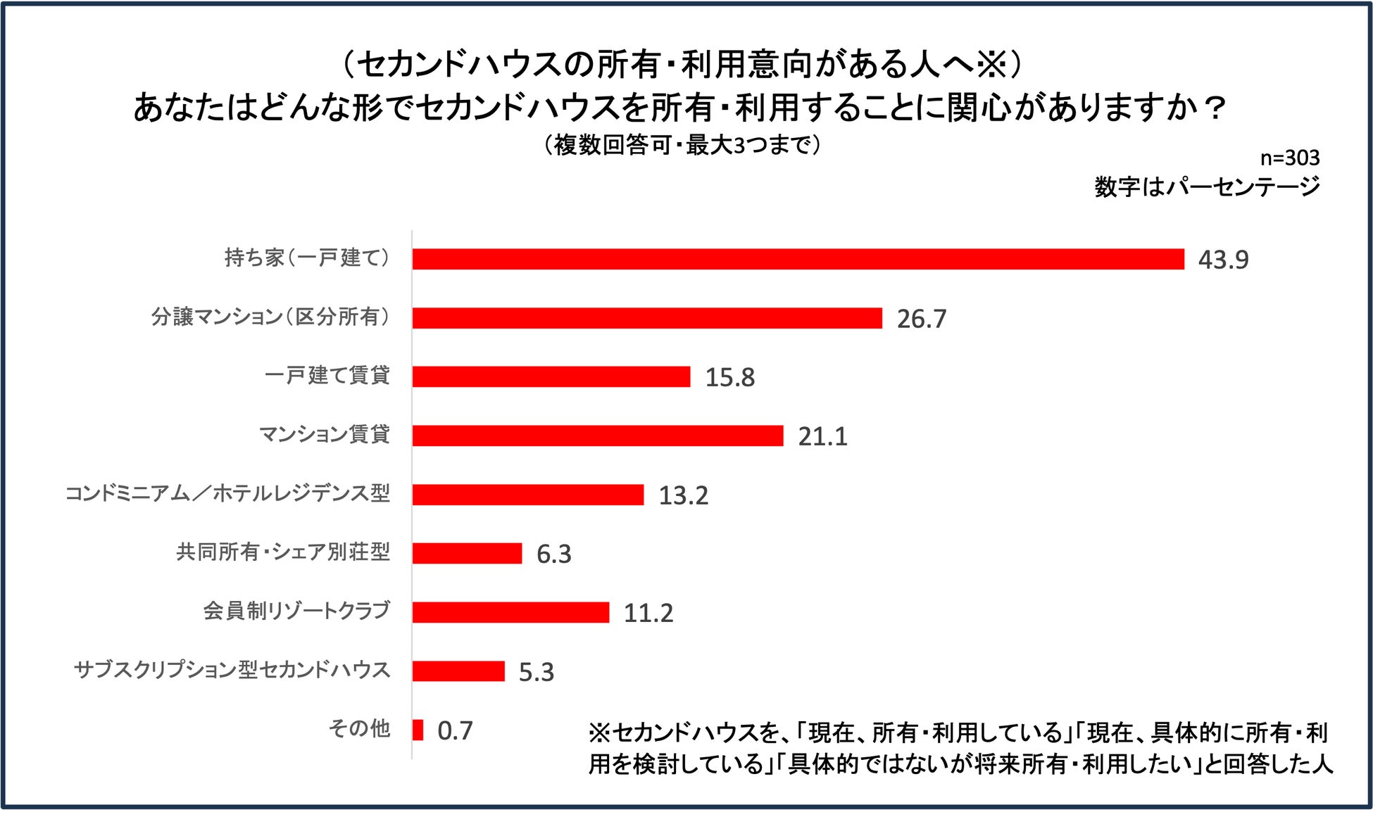 ユーザー層、検討層、関心層(セカンドハウスを「現在、所有・利用している」「具体的に所有・利用を検討している」「具体的ではないが、将来所有・利用したい」と回答した人)の303名に、興味のある物件を聞いたところ(複数回答可、最大3つ)、最も多かったのは「持ち家(戸建て)」の43.9%。続いて「分譲マンション(区分所有)」の26.7%が続き、賃貸やサブスクリプションなどの「利用」より、物件「所有」の意向が高いことがわかりました。