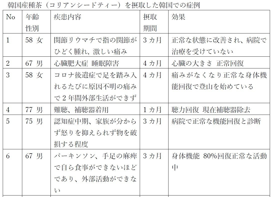 ・韓国産種茶(コリアンシードティー)には、認知機能の改善効果、関節リウマチの改善効果が報告されているが、まだ、日本における介入研究は行われていない。