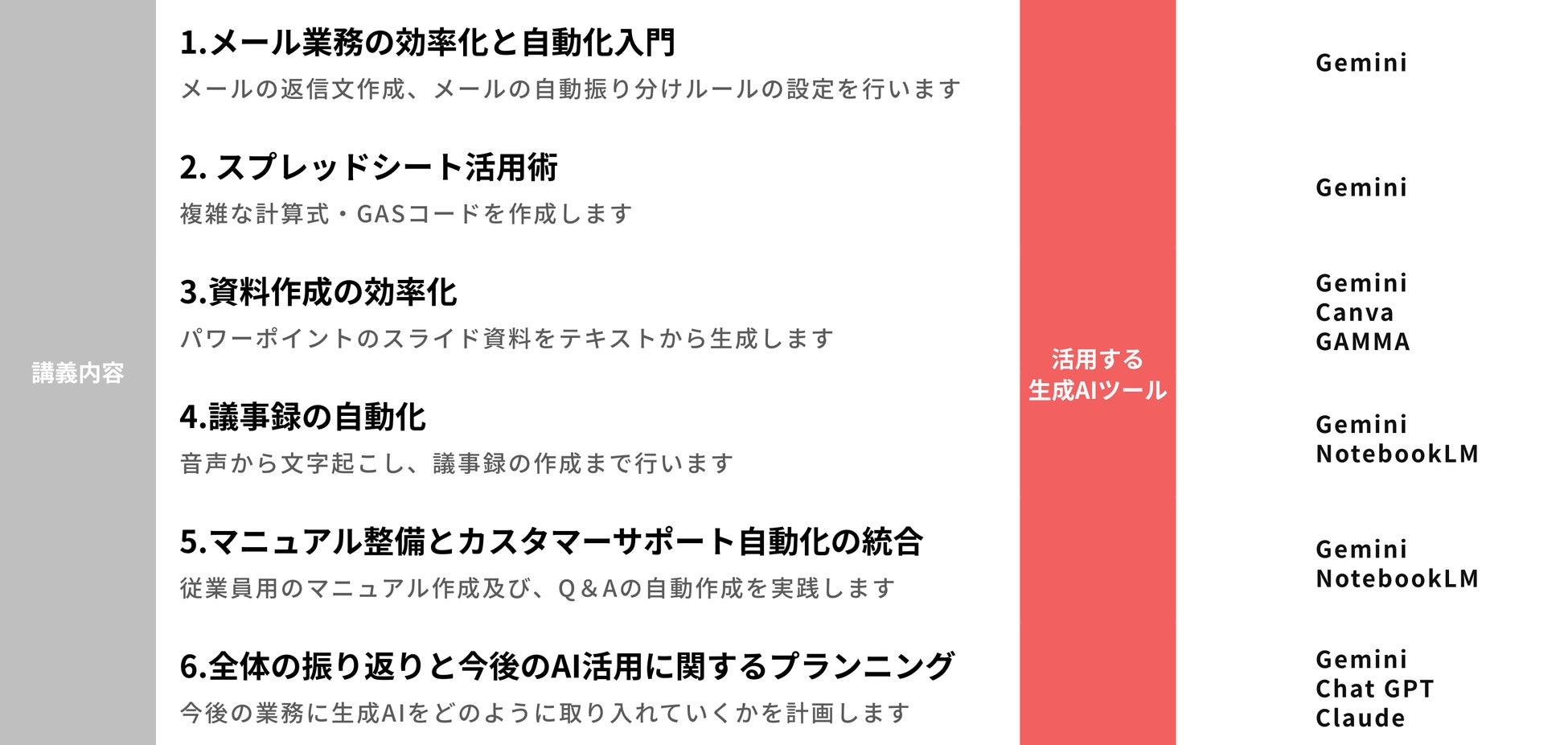 ChatGPT、Claude、Gemini、Perplexity AI、Canvaなど、複数のAIツールの使い分け・組み合わせを習得し、以下のような即効性のある業務改善を実現します。