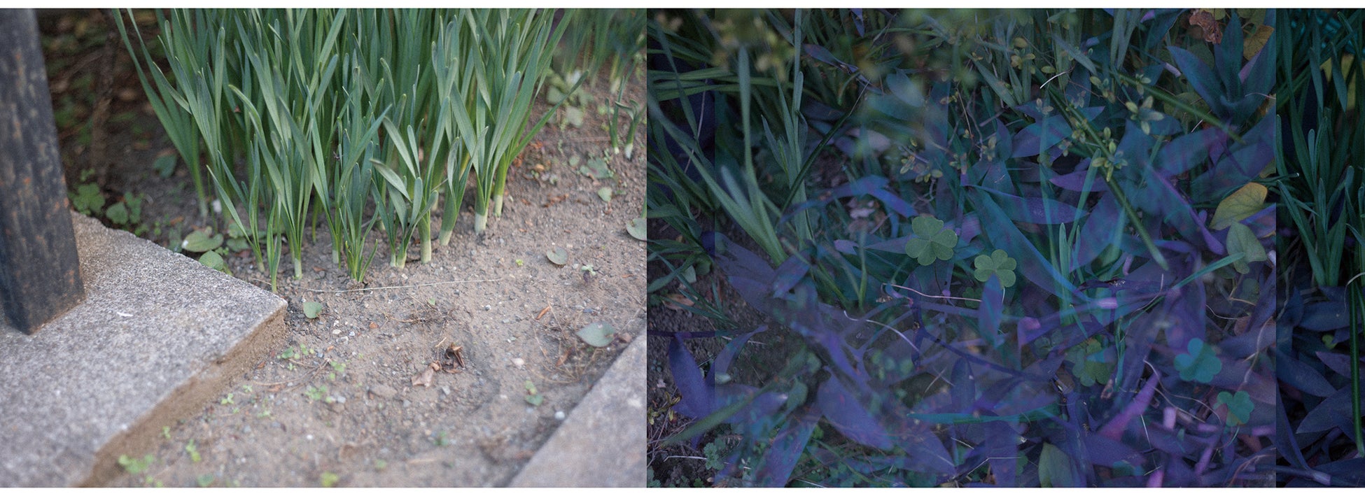 フロアには一続きの写真群が2枚、貼り込まれています。陰の深まり光の温もりを実感する季節、一方は地に、もう一方は空に映る草木の姿を様々の時間・移ろい・まなざしの中で描きます。